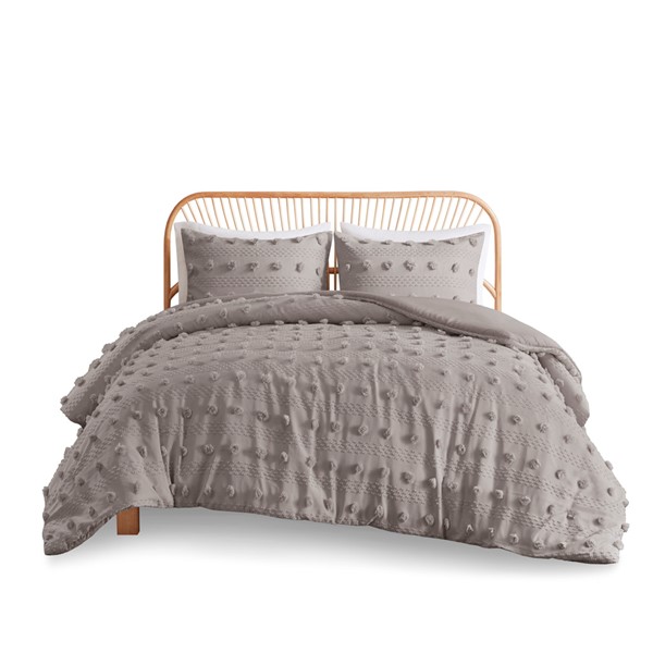 Refresh your bedroom with the elegant style of Intelligent Design’s Lucy Clip Jacquard Duvet Cover Set. This beautiful duvet cover features fun and playful clip jacquard pompoms all over the face that add dimension to the top of the bed for a lovely look. The matching shams (1 in Twin/TwinXL) also flaunt the delicate design of the duvet cover to complete the jacquard bedding set. Machine washable for easy care, this elegant duvet cover set is OEKO-TEX certified, meaning it does not contain any harmful substances or chemicals to ensure quality comfort and wellness. An antimicrobial treatment helps reduce the growth of odor causing bacteria and keeps fabric lasting longer. A button closure at the foot end allows you to place a padded insert within the duvet cover and internal corner ties prevent it from shifting (Insert is NOT included).
