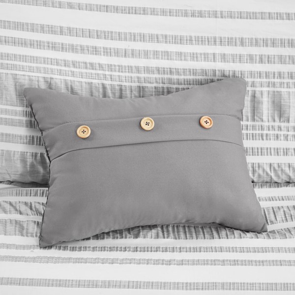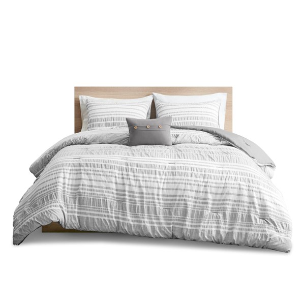 The Intelligent Design Lumi Striped Comforter Set offers a chic casual comfort to your bedroom. This comforter features a modern grey stripe pattern that has a ruched and yarn-dyed look to create dimension, for a contemporary style. A solid grey reverse pairs handsomely with the top of the bed. The 2 matching shams (1 in Twin/TwinXL) repeat the design of the comforter, while 1 decorative pillow provides the finishing touch. This striped comforter set also has an antimicrobial treatment that provides built-in freshness protection, reducing the growth of odor causing bacteria to keep fabric lasting longer. Items in the set may come in a rolled or compressed packaging, which will need to be fluffed up or steam ironed before use to remove wrinkles.