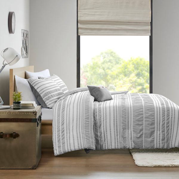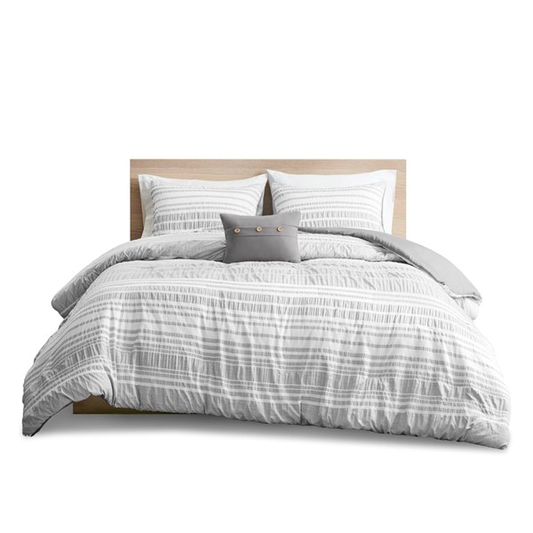 The Intelligent Design Lumi Striped Duvet Cover Set offers a chic casual comfort to your bedroom. This duvet cover features a modern grey stripe pattern that has a ruched and yarn-dyed look to create dimension, for a contemporary look.