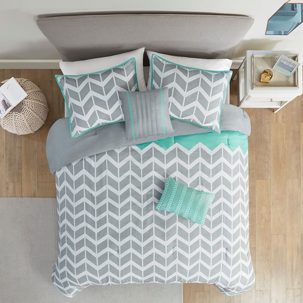 The Intelligent Design Nadia Comforter Set updates any bedroom into fun and inviting space. This stylish comforter features a grey and white chevron print broken up by white vertical stripes and a solid aqua at the top that pops! The 2 matching shams (1 in Twin/TwinXL) with an aqua flange pairs perfectly with the delightful chevron pattern, while 2 decorative pillows in coordinating colors help complete the look. Made from ultra-soft microfiber, this comforter set is machine washable for easy care. This bedding set uses an antimicrobial treatment that provides built-in freshness protection, reducing the growth of odor causing bacteria to keep fabric lasting longer.