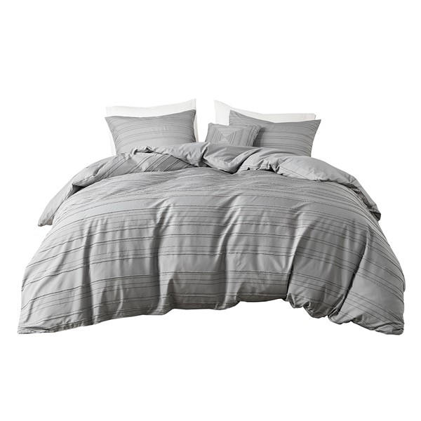 Add a casual and modern touch to your bedroom with the Oliver clip jacquard duvet cover set. The duvet cover and matching shams (1 in Twin/Twin XL) feature a woven striped pattern and clip jacquard design for a contemporary update to your bedroom, while a coordinating square decorative pillow completes the bedding set. This duvet cover set is also OEKO-TEX certified and is machine washable for easy care. A button closure at the foot end allows you to place a padded insert within the duvet cover and internal corner ties prevent it from shifting. Inserts for duvet covers are sold separately.