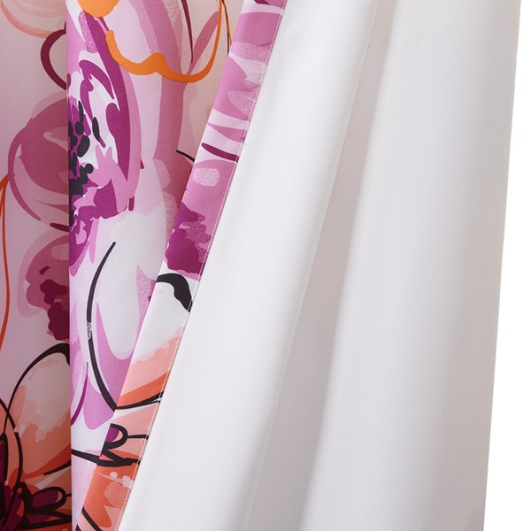 Intelligent Design Olivia Total Blackout Window panel uses bright colors and an asymmetrical floral design to brighten up your space. Pops of pink, orange, grey, and plum flowers adorn one side of the panel, creating contrast against the white ground for an abstract look. Finished with a heavy 3 pass foamback liner, this panel is 100% total blackout for a maximum barrier against all exterior light and noise intrusion for the utmost privacy, while the thermal technology provides energy efficiency. Grommet top makes this panel easy to hang, open, and close through the day; fits up to a standard 1.25" diameter rod. Machine washable for easy care; complete the collection with coordinating bedding and shower curtain sold separately.