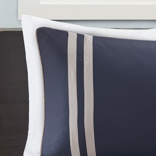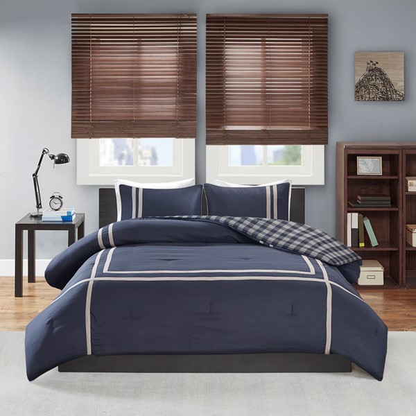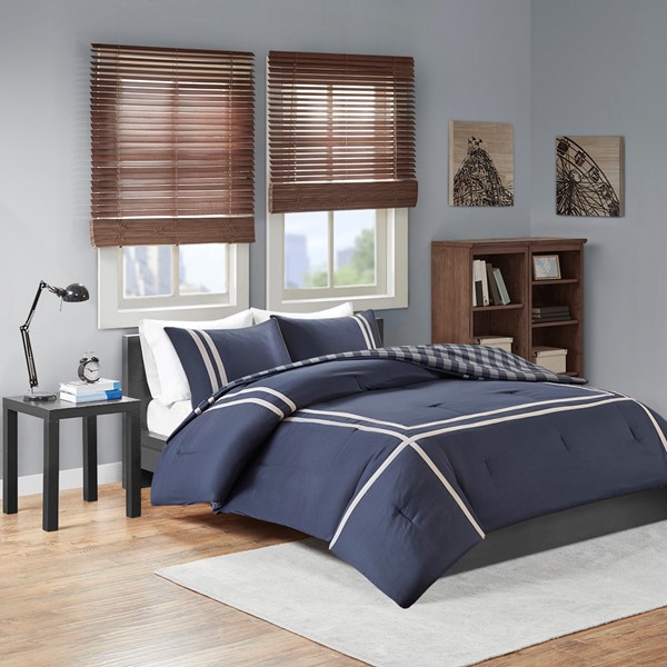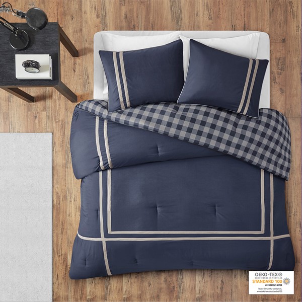 The Intelligent Design Oxford Reversible Comforter Set offers a simple and handsome update to your bedroom. This navy reversible comforter features grey taping details on top of the bed and flips to a printed buffalo check pattern on the reverse. Matching reversible shams (1 in Twin/TwinXL) mirror the reversible design of the comforter to create a chic casual look. Made from ultra-soft microfiber fabric, this reversible comforter set is also OEKO-TEX certified, meaning it does not contain any harmful substances or chemicals, and uses an antimicrobial treatment that provides built-in freshness protection, reducing the growth of odor causing bacteria to keep fabric lasting longer.