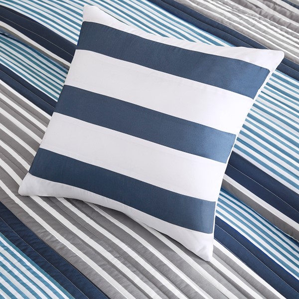 Give your bedroom a fresh new look with the Intelligent Design Paul Reversible Quilt Set. This quilted quilt features a modern striped print with wide and thin stripes in white, grey, navy, and teal with a solid grey reverse to create a handsome look. The 2 matching shams (1 in Twin/TwinXL) also showcase a simple stripe pattern that pairs perfectly with the comforter, while 2 decorative pillows add the finishing touches. Machine washable for easy care, this striped quilt set uses an antimicrobial treatment that provides built-in freshness protection, reducing the growth of odor causing bacteria to keep fabric lasting longer.