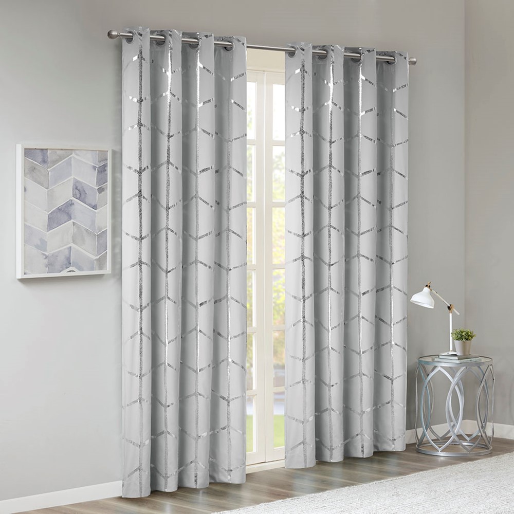 Freshen up your space with the enchanting style of Intelligent Design Raina Window Panel. The stunning panel flaunts a geometric, metallic silver print against a light grey ground for a fun and eye-catching look! Finished with a heavy 3 pass foamback liner, this panel is 100% total blackout providing energy efficiency and added privacy. Grommet top makes this panel easy to hang, open, and close through the day. Machine washable for easy care; complete the collection with coordinating bedding and shower curtain sold separately.