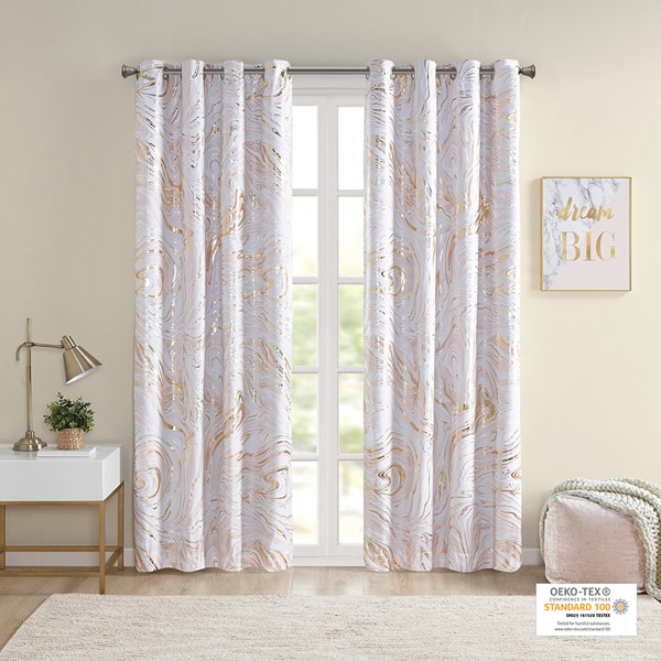 The Intelligent Design Rebecca Grommet Top Printed Marble Metallic Blackout Curtain adds a gorgeous and striking update to your bedroom decor. This window panel flaunts a gold marble metallic print on an ultra-soft blush microfiber base. Using thermal technology on the back of the curtain panel, a 3-Pass foamback liner blocks 100% exterior light and noise, while providing excellent energy efficiency and maximum privacy. This window panel is also OEKO-TEX certified, meaning it does not contain any harmful substances or chemicals, ensuring quality comfort and wellness. Easily hang this window panel using the silver grommet top that fits up to a 1.25" diameter rod. Machine washable for easy care, this 100% blackout panel adds a stunning modern touch to your bedroom and helps provide a restful night’s sleep. 2 curtain panels must be purchase for each window for standard coverage. Coordinating bedding is available and sold separately.