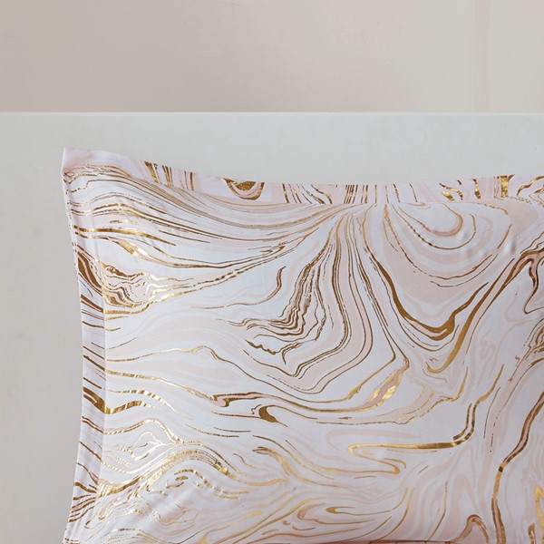 Make your bedroom shine with the Intelligent Design Rebecca Metallic Printed Comforter Set. This extra-soft, brushed microfiber comforter flaunts a swirl marble print in blush, white, and gold metallic hues, for a stunning contemporary design. A solid blush reverse complements the top of the bed, while matching shams (1 in Twin/TwinXL) mirror the look of the comforter. Two decorative pillows with shiny gold thread add the perfect finishing touches to the modern comforter set. This bedding set is OEKO-TEX certified, meaning it does not contain any harmful substances or chemicals, and uses an antimicrobial treatment that provides built-in freshness protection, reducing the growth of odor causing bacteria to keep fabric lasting longer.