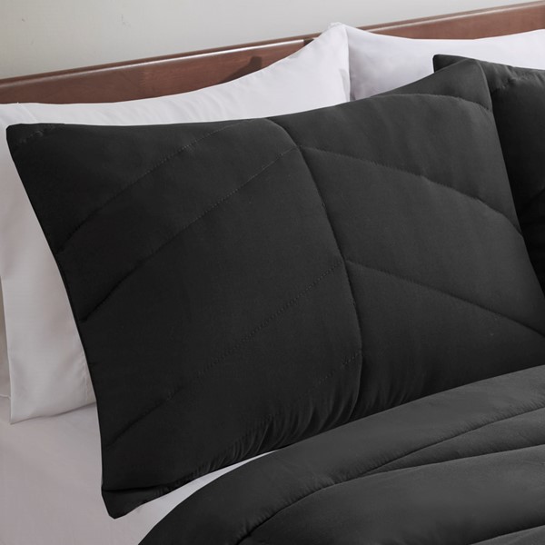 This queen size comforter set is stylish and chic with its trendy, black, quilted design and matching pillow shams. The unique yet casual look is perfect for a modern and contemporary bedroom. Made from 100% polyester and polyester microfiber fill.