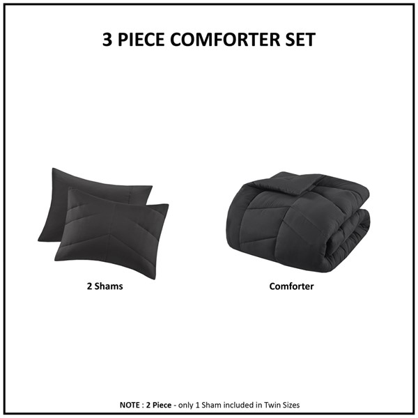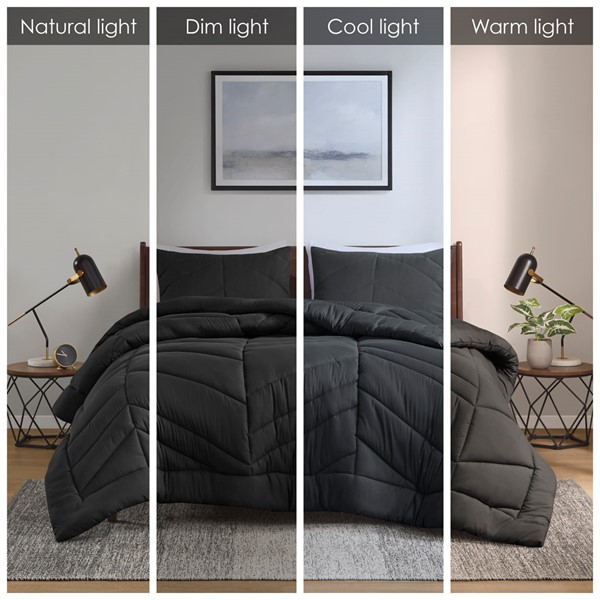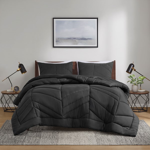 This queen size comforter set is stylish and chic with its trendy, black, quilted design and matching pillow shams. The unique yet casual look is perfect for a modern and contemporary bedroom. Made from 100% polyester and polyester microfiber fill.