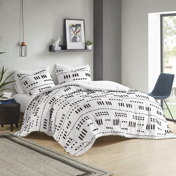 The Intelligent Design Riku Clip Jacquard Comforter Set brings a bold, modern update to revitalize your bedroom. This comforter features an abstract black clip jacquard pattern that pops against the white base fabric for a beautiful contrasting look. The matching shams (1 in Twin/TwinXL) repeat the contemporary design of the comforter to give your bed a chic casual allure. Hypoallergenic polyester filling in the jacquard comforter contains no allergens and is treated to be dustproof. Machine washable for easy care, this modern comforter set is OEKO-TEX certified, meaning it does not contain any harmful substances or chemicals to ensure quality comfort and wellness. An antimicrobial treatment helps reduce the growth of odor causing bacteria and keeps fabric lasting longer. Items may come in rolled or compressed packing and will need to be fluffed up. Use a steam iron to help remove wrinkles easier.