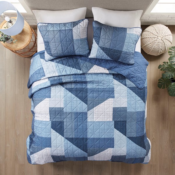 Bring a sharp, modern update to your bedroom with the Intelligent Design Skyler Patchwork Printed Reversible Quilt Set. The quilt features a geometric patchwork print in various shades of blue with a solid blue reverse, for 2 unique looks. Pre-washed fabric with cotton filling add softness and comfort, while matching shams (1 in Twin/TwinXL) complete the contemporary design of the quilted quilt. Machine washable for easy care, this printed reversible quilt set has an antimicrobial treatment that provides built-in freshness protection, reduces growth of odor causing bacteria, and keeps the fabric newer, longer.