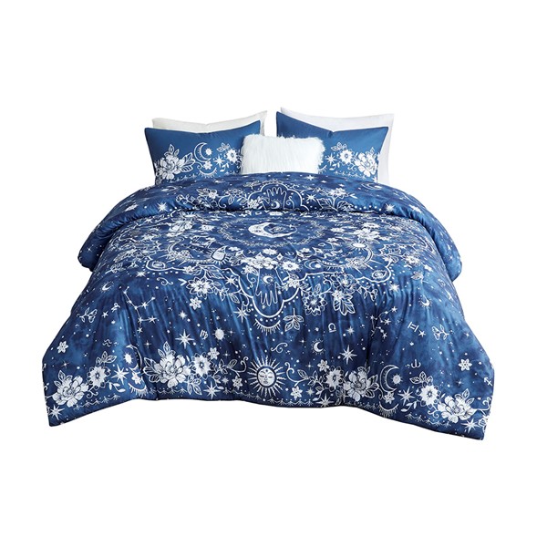 The Intelligent Design Stella Celestial Duvet Cover Set offers a magically alluring update to your bedroom. The navy duvet cover features a celestial medallion print of stars, moons, and constellations with floral accents, for a stunning space look. Coordinating shams (1 in Twin/TwinXL) pair beautifully with the duvet cover, while a square decorative pillow adds a textured finishing touch to the space comforter set. An antimicrobial treatment provides built-in freshness protection, reduces growth of odor causing bacteria, and keeps the fabric newer, longer. Machine washable for easy care, this space-inspired duvet cover set may come in rolled or compressed packing and will need to be fluffed up. Use a steam iron to help remove wrinkles easier. A button closure at the foot end allows you to place a padded insert within the duvet cover and internal corner ties prevent it from shifting (Insert is NOT included).