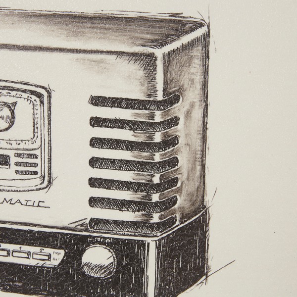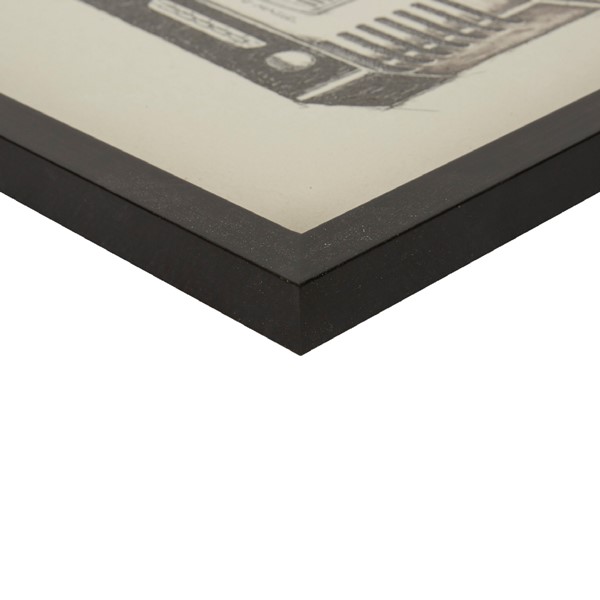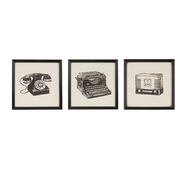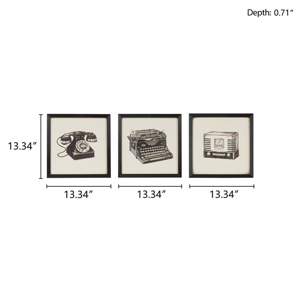The Intelligent Design Vintage Models by Artist James Wiens is a three piece shadowbox set brings a cool and casual update to your space. This set features printed designs of an antique radio, rotary phone, and typewriter in rich black tones on a neutral background for a nice contrast; while a sleek black frame adds the finishing touch. A gel coat finish provides added texture and a glossy touch, while also preventing fading over time. Sold as a 3 piece set, each piece measure 13.34×13.34" and is finished with a Sawtooth hardware on the reverse making this set easy to hang and arrange on any wall. Spot clean only.
