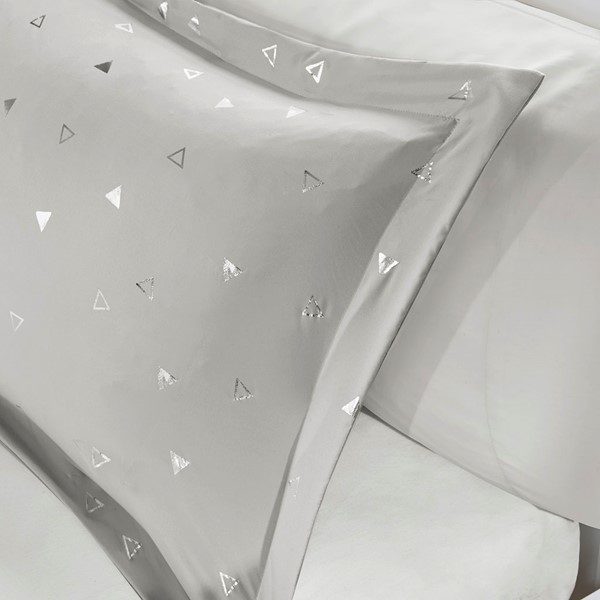 Add some shimmer and shine to your bedroom with Intelligent Design’s Zoey Metallic Triangle Print Comforter Set. Made from ultra-soft microfiber, the grey comforter and 2 matching shams (1 in Twin/TwinXL) flaunt an ombre silver triangle pattern for a striking touch of glam. A solid grey reverse complements the top of the bed, while 2 decorative pillows provide the finishing touches to this bedding set. The square pillow features the word "hello" embroidered on the face and the oblong pillow uses fabric manipulation for added dimension and texture. Machine washable, this metallic comforter set provides a fun and flashy update to your bedroom decor. This bedding set uses an antimicrobial treatment that provides built-in freshness protection, reducing the growth of odor causing bacteria to keep fabric lasting longer.