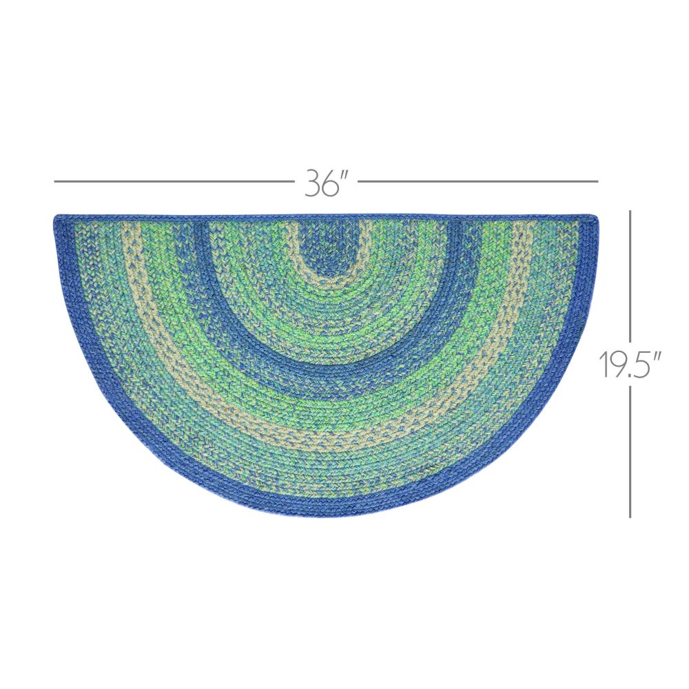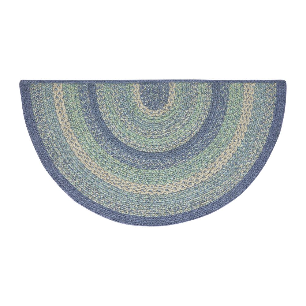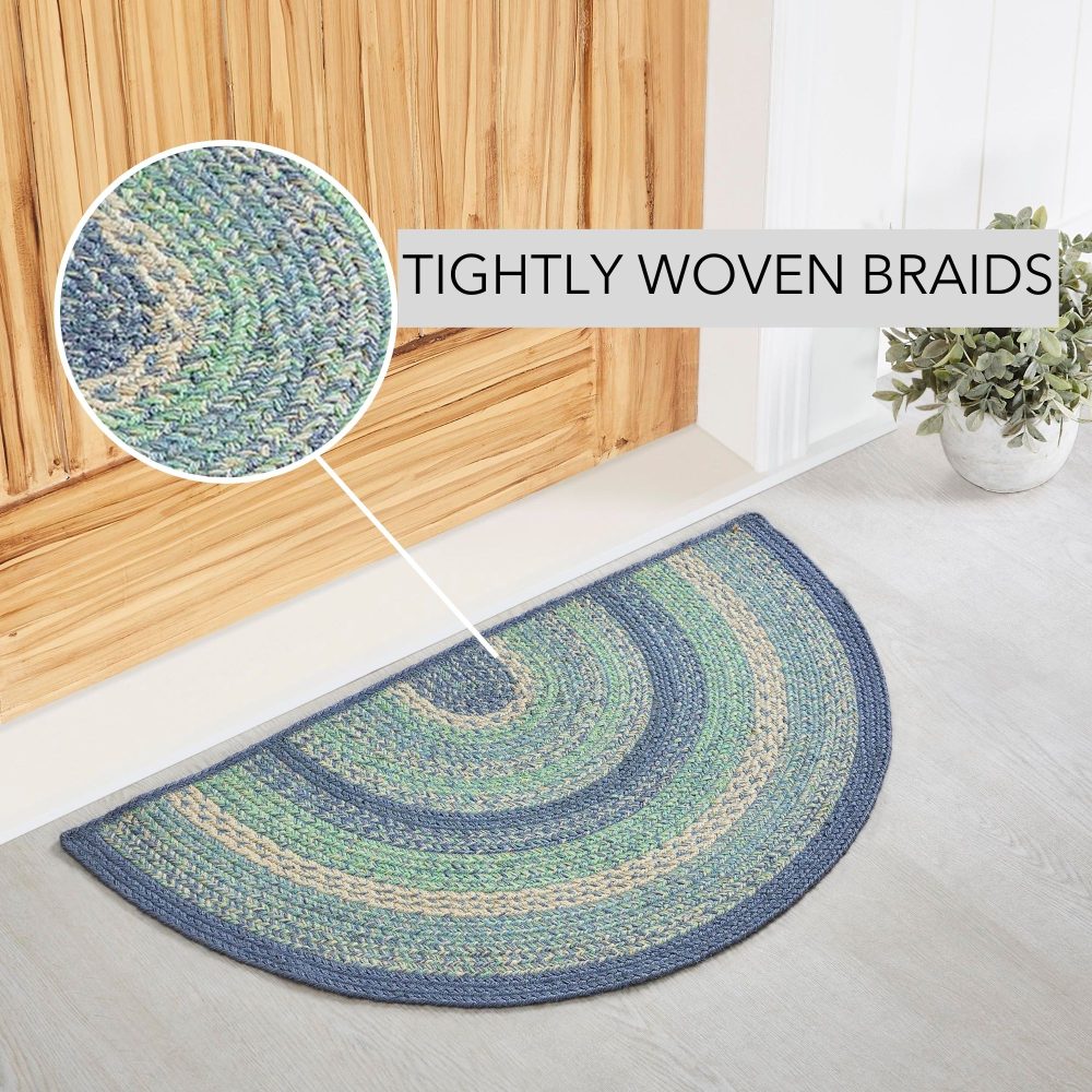 Create a cheerful, welcoming entryway or kitchen with bright, coastal colors in a curl-resistant jute blend that adds style and safety wherever you stand. The Jolie Jute Rug measures 19.5x36 inches and features a classic half circle shape and tight braids constructed with a durable jute blend. The special blend relaxes faster and stays flat. Features a blend blue, green and creme for a coastal country look that complements a wide array of farmhouse and cottage decor.