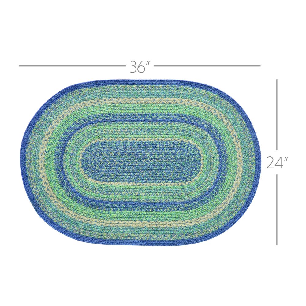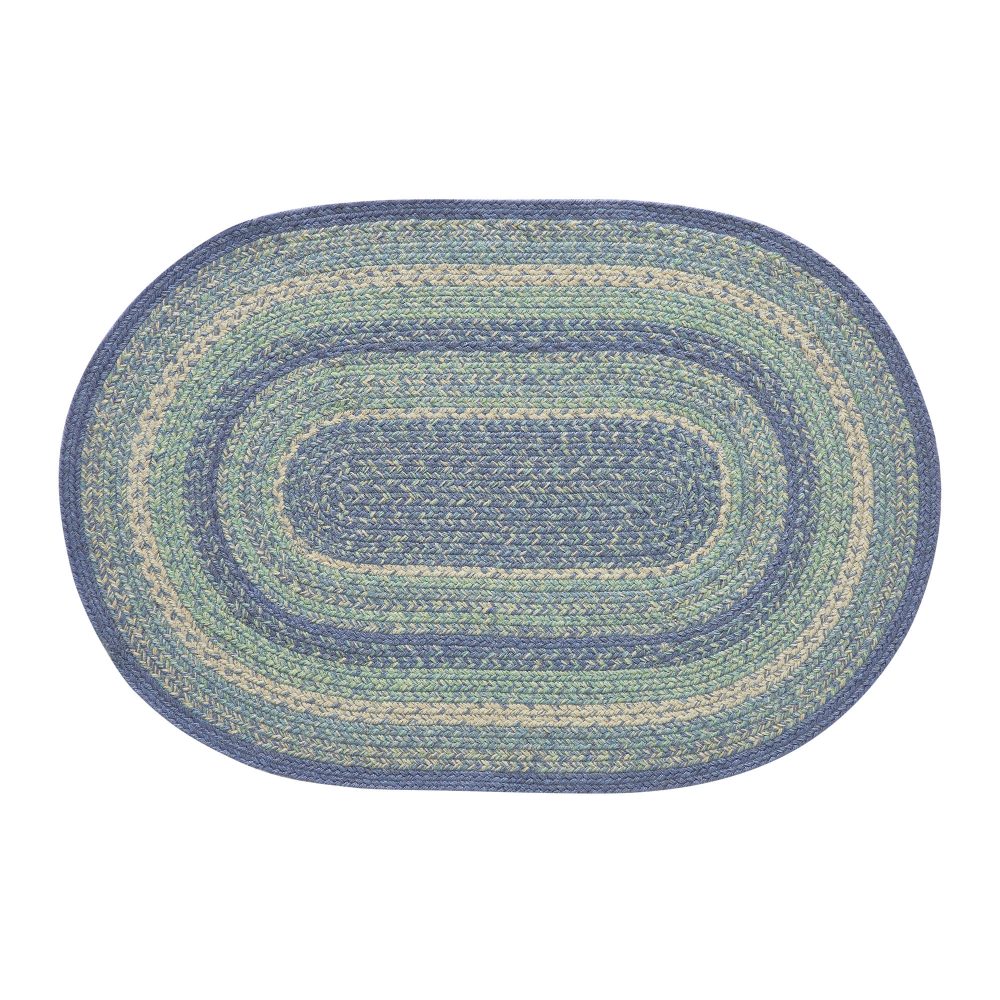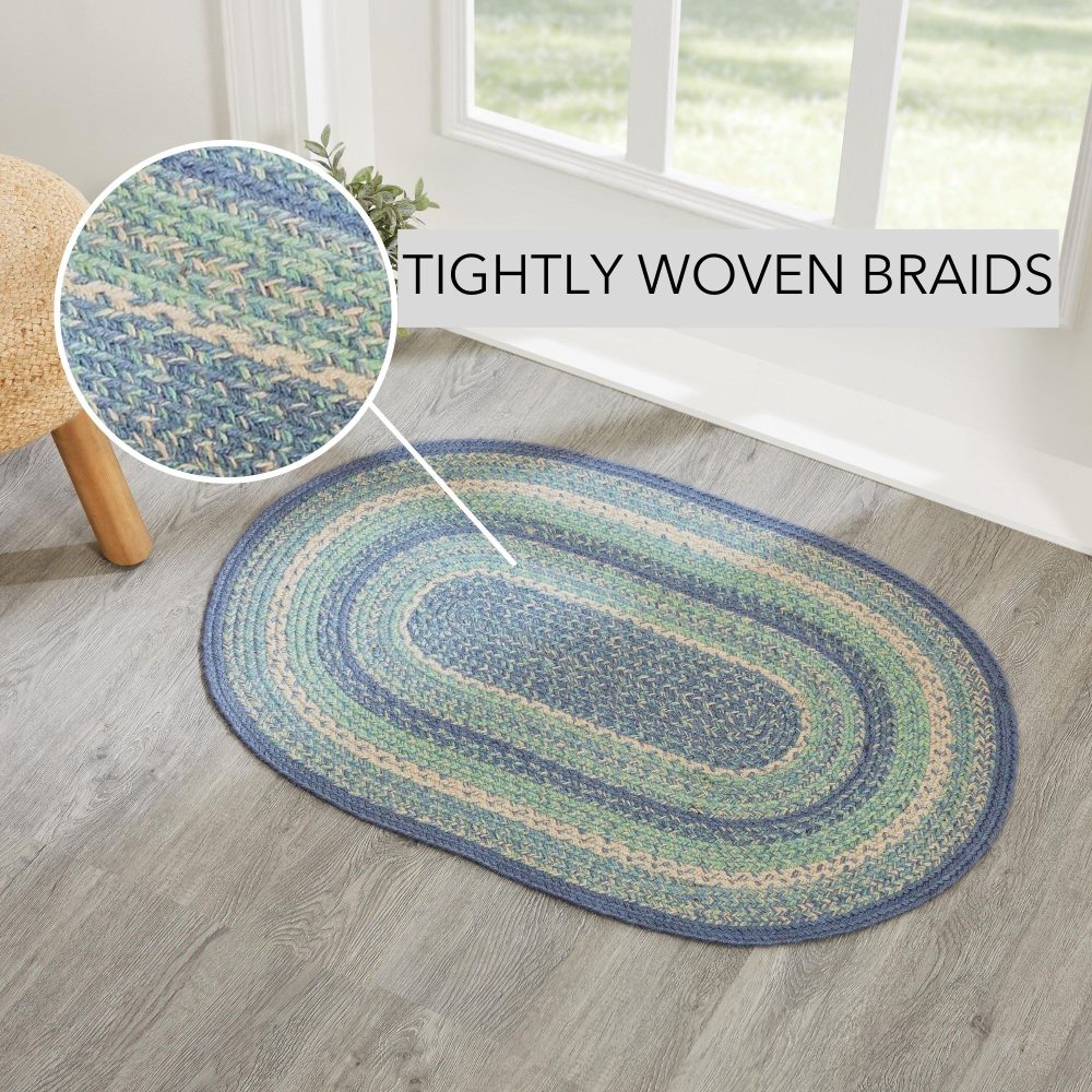 Create a bright, coastal look for your entryway with soft shades of blue and green in a curl-resistant jute blend that adds style and safety. The Jolie Jute Rug measures 24x36 inches and features a classic oval shape and tight braids constructed with a durable jute blend. The special blend relaxes faster and stays flat. Features a blend of blue, green and creme for a soft, shabby chic look that complements a wide array of country farmhouse decor.