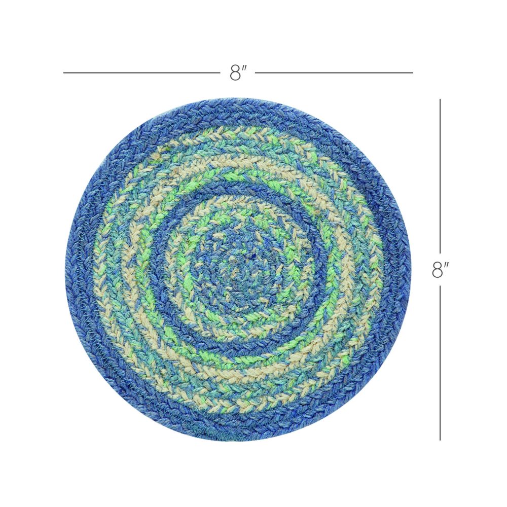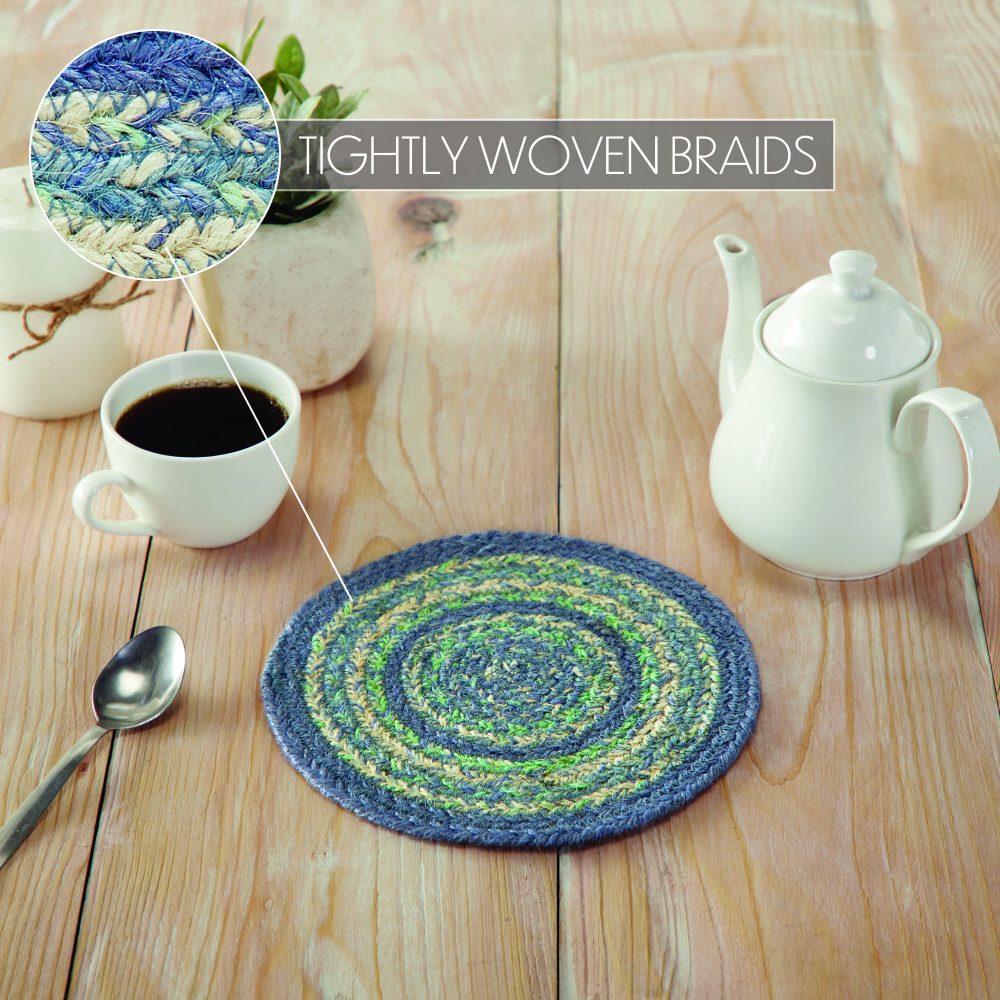 Create a joyful table for friends and family to gather round with modern color and classic texture while protecting dining tables from heat and moisture. The Jolie Jute Trivet includes an individual circular trivet with a 8-inch diameter made from a premium Jute blend. The rich texture of braided jute is given a modern twist with soft blue and green colors for a casual coastal country style. Complete your tabletop decor with other pieces from the Jolie Collection by VHC for modern farmhouse style.