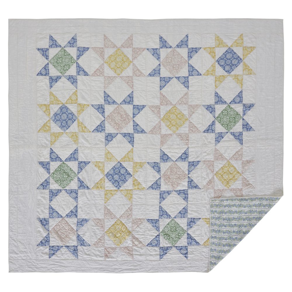 - HAND-QUILTED PATCHWORK: This classic star pattern quilt features Stitch in the Ditch and Channel quilting techniques for superior style and durability. Includes a white cotton-linen blend base and reverses to a dusty blue floral print on a super soft voile fabric.