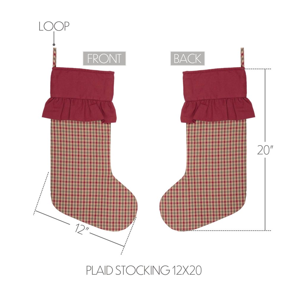 • DETAILED FEATURES: This truly festive stocking features traditional deep red, olive green, and tan plaid fabric beautifully finished with a solid deep red cuff trimmed gracefully with a ruffle for a unique country flair.