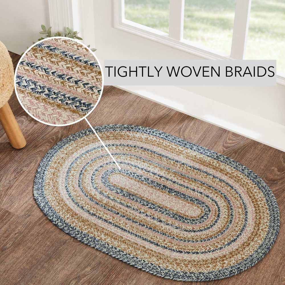 Create a bright, springtime look for your entryway with soft shades of blue and pink with a seasonal design in a curl-resistant jute blend that adds style and safety. The Kaila Jute Rug measures 24x36 inches and features a classic oval shape and tight braids constructed with a durable jute blend. The special blend relaxes faster and stays flat. Features a blend of dusty blue, misty rose and creme for a soft, shabby chic look that complements a wide array of Spring country farmhouse decor.