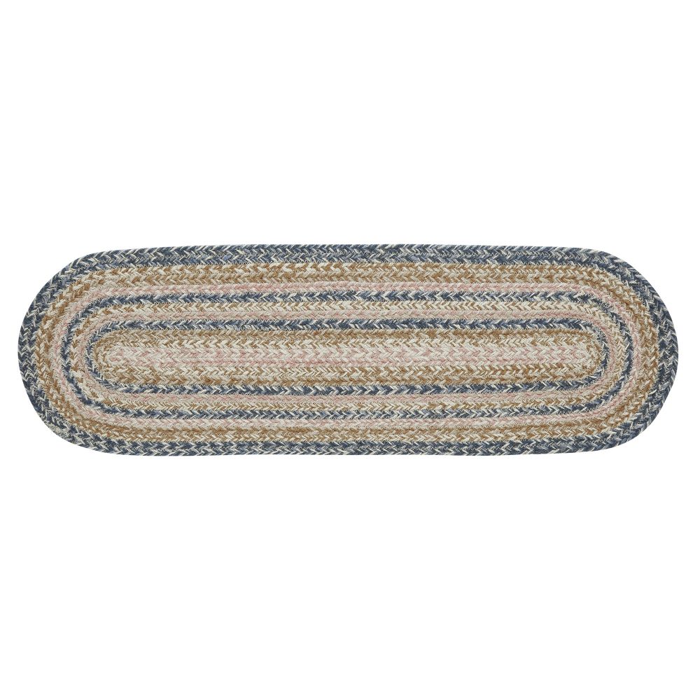 Protect stairways from damage and add style with braided jute in bright, modern tones. The Kaila Jute Stair Tread Oval includes one 8.5x27 inch stair tread back by a latex spray to help prevent slipping. The low-profile jute features an innovating blend of 80 percent Jute and 20 percent cotton and other fibers to help the tread lay flat and resist creasing. This oval-shaped tread features a blend of blue, misty rose and golden tan braids for a cheerful, country boho look. Coordinates with the Kaila Collection by VHC for a complete modern farmhouse set featuring bedding, rugs, kitchen accessories and more.