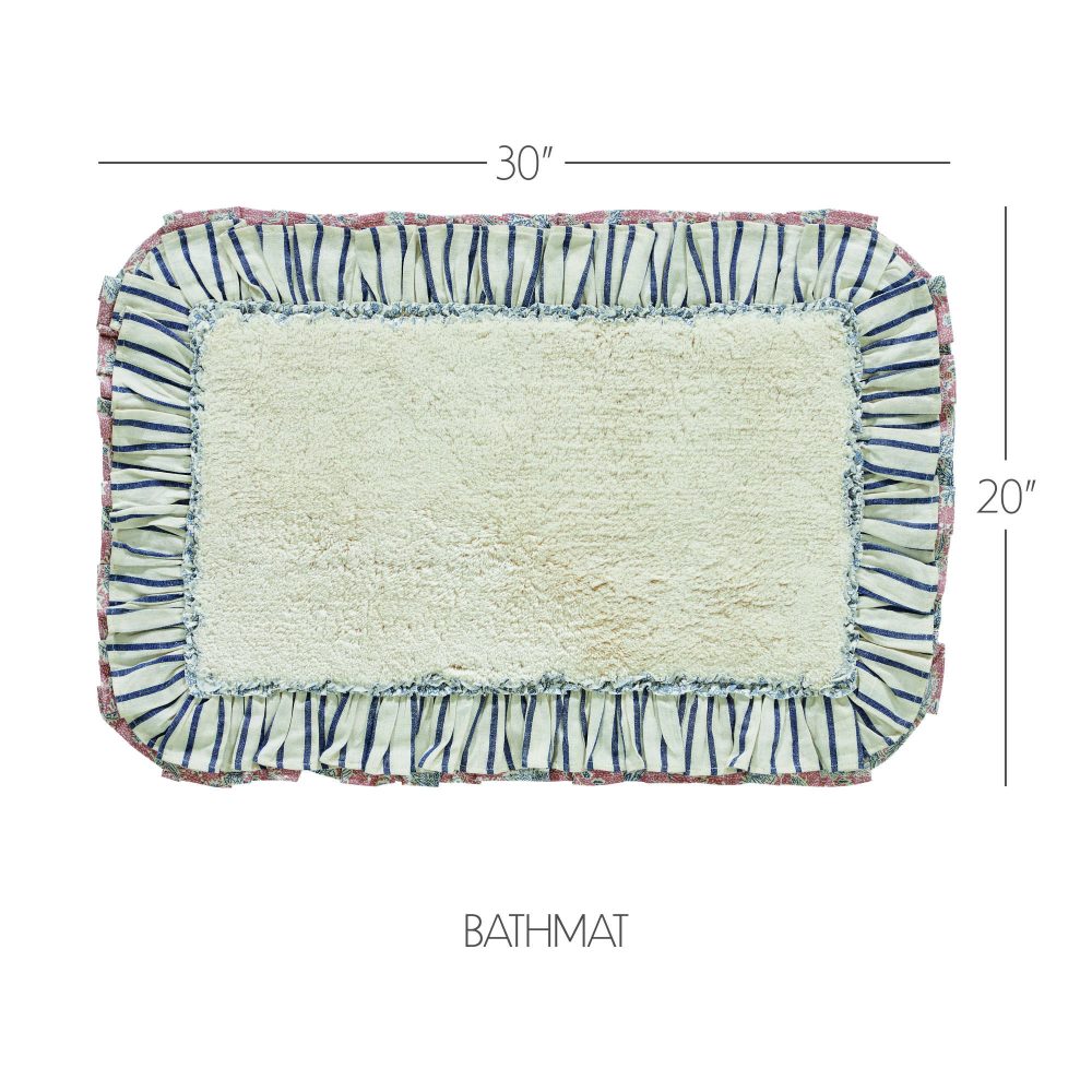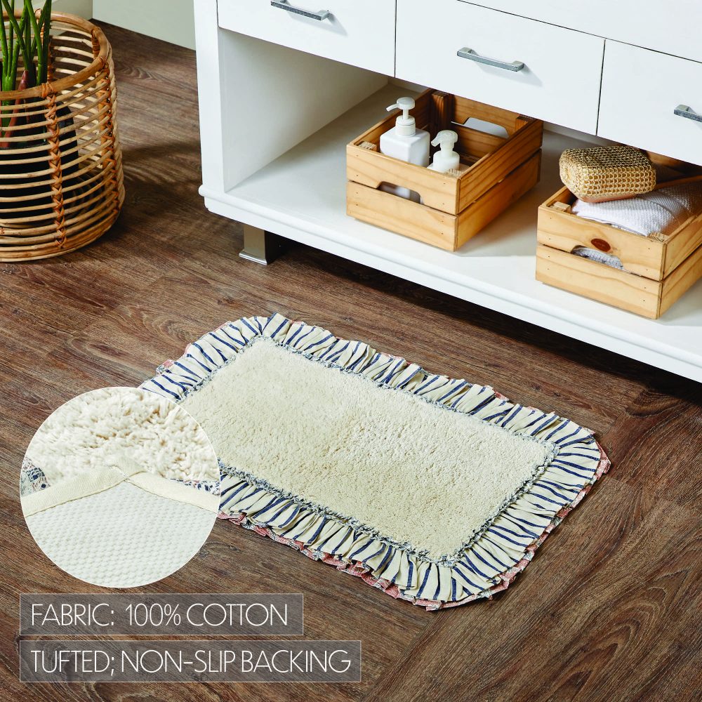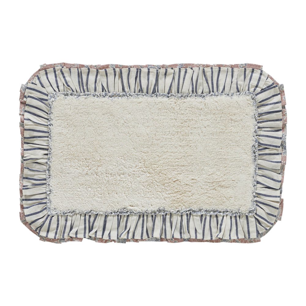 Step out of the shower and into cozy country farmhouse bliss. The Kaila Bath Mat 20x30 features a solid creme core in premium, ultra absorbent cotton. It is trimmed with a ruffled vintage striped fabric in navy blue and creme layered with a vintage floral in misty rose. Backed with textured rubber to produce a quality, non-slip surface without the need for a separate rug pad. This ruffled bath mat is a great finishing piece for bathrooms or laundry rooms where you need the perfect balance of style and functionality.