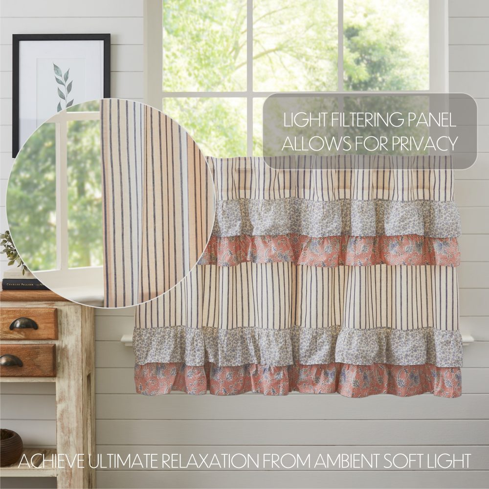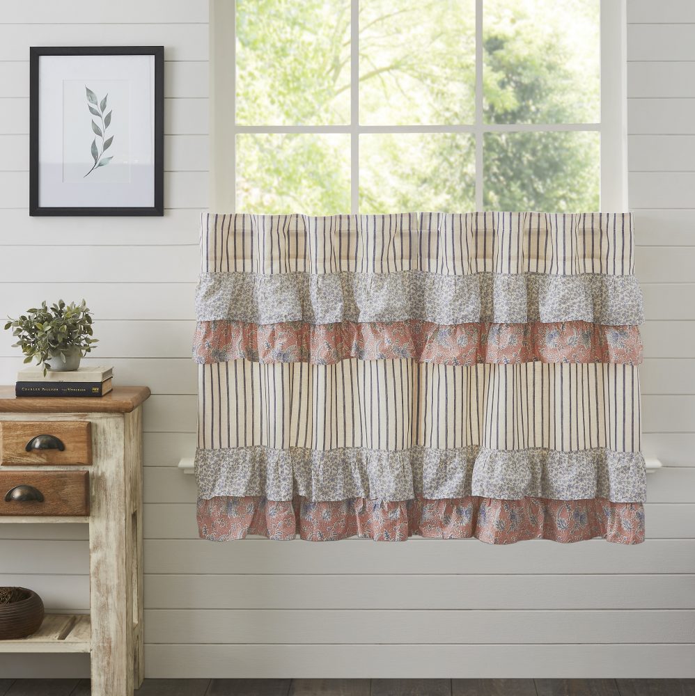 Create the perfectly charming country window of your dreams with these 36 x 36 inch tier-style curtains. Featuring a base of creme and navy blue ticking stripes with vintage floral ruffled details, the Kaila Ticking Blue Ruffled Tier Set provides just the right balance of privacy and sunshine. Pair with a matching valance or prairie swag for a fully decorated look or alone for a simple pop of color and character. Also known as cafe or bistro curtains, these are a particularly good fit for decorating vintage kitchens, living rooms, and small bathroom windows.
