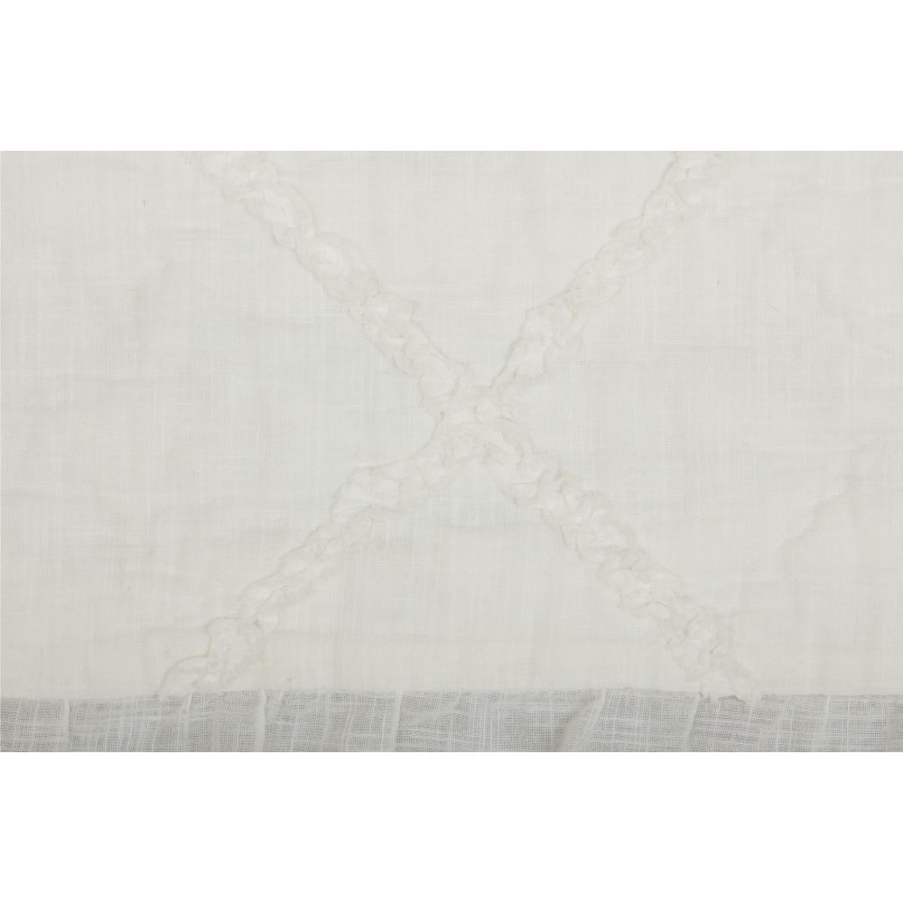 When you want to add romance and a soft touch to your bedroom, look no farther than the casually sophisticated Kathryn Quilt. Featuring open, slub-weave cotton, the fabric has a lightness that adds a breathability and luxurious, insulating warmth, along with unexpected durability. A soft, creamy white tone brings a fresh, clean palette that adds organic richness and sought-after charm. Gracing the Kathryn bedding is a pattern of repeating on-point 10 x 10 blocks with hand-quilted micro-ruffles framing each of the diamond squares. The quilt features a unique, touchable appeal and delightful details and textures. Perfectly-gathered ruffles are sewn to three sides of the quilt, adding to the lovely drape of the bedding as it gracefully falls toward the floor. The quilt reverses to a soft, lush voile that adds a luxurious coziness to the quilt. An inner layer of cotton batting adds just the right loft and warmth, keeping the quilt lightweight and versatile.