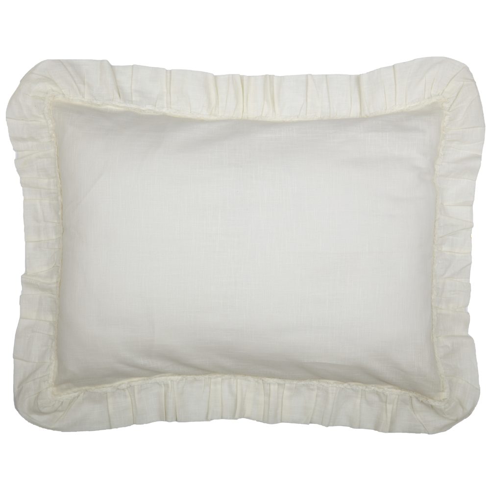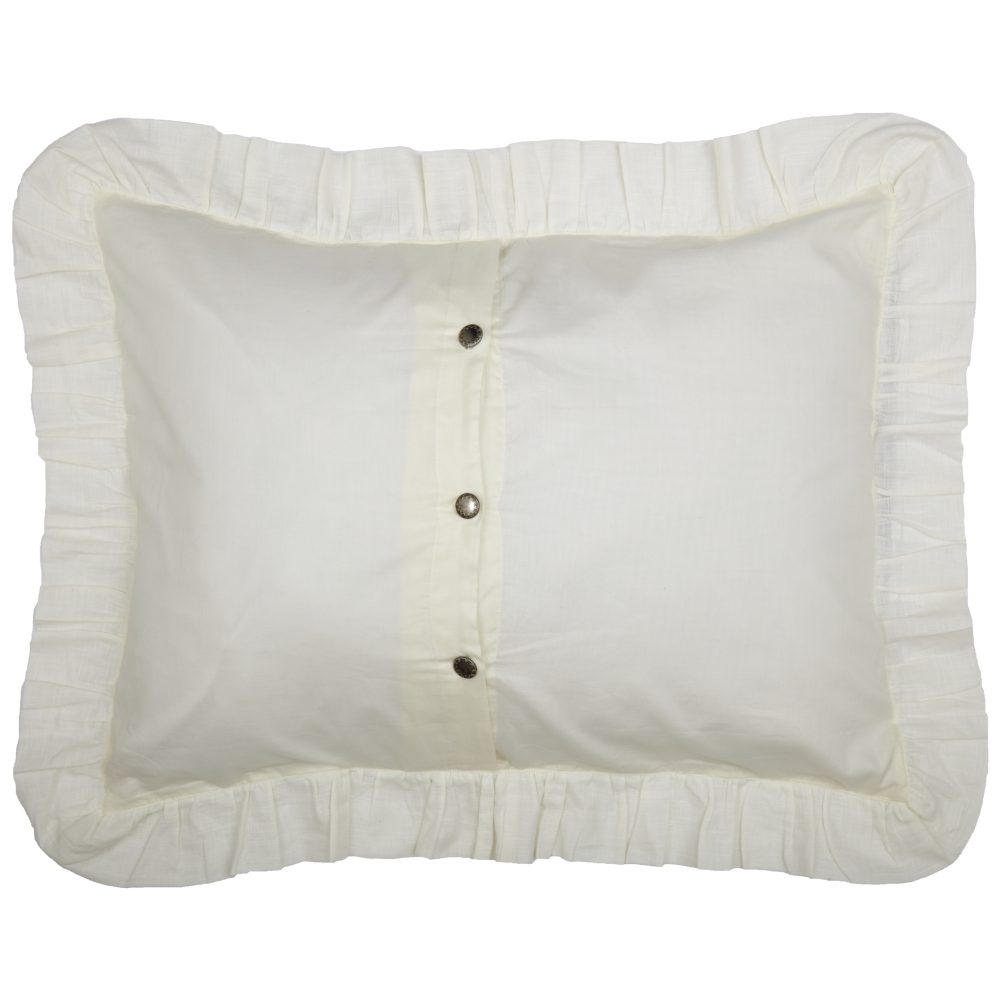 - Features a 3 ruffle plus micro-ruffles sewn along the front seams for extra texture and detailing. Reverses to soft voile fabric. Three vintage style metal buttons hold your pillow in place.