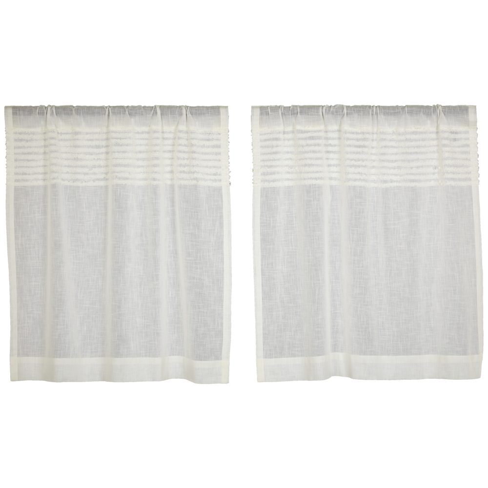 It's easy to create the farmhouse of your dreams when you start with the Original Kathryn Collection. Featuring a soft, cotton muslin that mimics the look of linen and has a lightness that offers breathability and cozy warmth, along with unexpected durability. A soft, creamy white tone brings a fresh, clean palette that softens windows and compliments existing fabrics and decor. The Kathryn Tiers (set/2) offer the very best in farmhouse fabrics right now. Nine rows of perfectly gathered micro ruffles are finely-stitched directly below the rod pocket, dressing up the curtain with rich texture and feminine flair. The unlined tiers complete their updated look without a header and offer dual hanging choices. The comfortable, familiar fabric and lush ruffles create a gentle, stylish upgrade to your home, combining easy-going style with casual luxury.