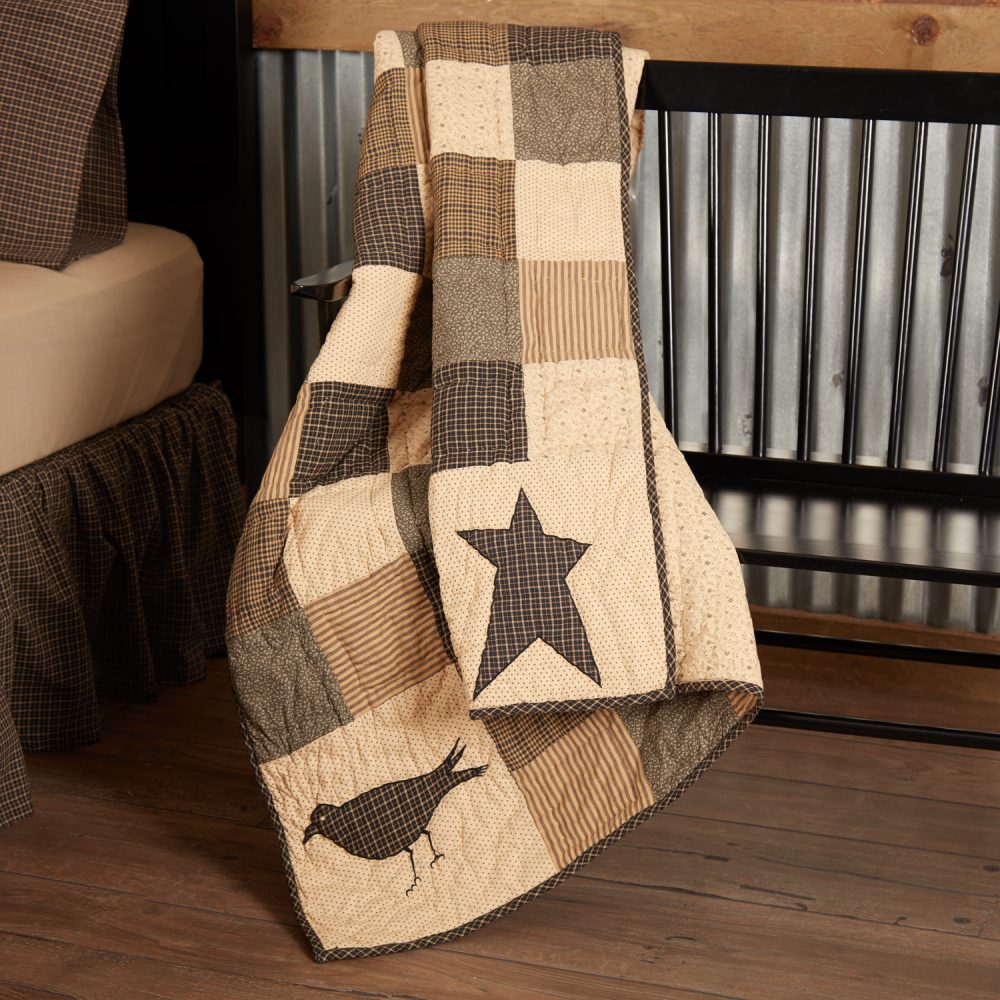 Add a folk-art touch to your primitive country decor with deep, neutral tones of black, tan and creme and rustic star and crow applique. The Kettle Grove Applique Crow and Star Quilted Throw measures 60x50 inches and adds primitive style to any sofa, chair or wall. The detailed throw blanket features a soft, quilted design with simple blocks and corner accents featuring primitive applique designs. The premium lap blanket is machine washable and iron safe and crafted in 100 percent cotton for a soft feel and durable wear. Reverses to a charming floral design in creme. Coordinates with the Kettle Grove Collection by VHC for matching modern primitive window treatments, bathroom accessories and bedding to bring the best of eye-catching, traditional country style to every corner of your home.