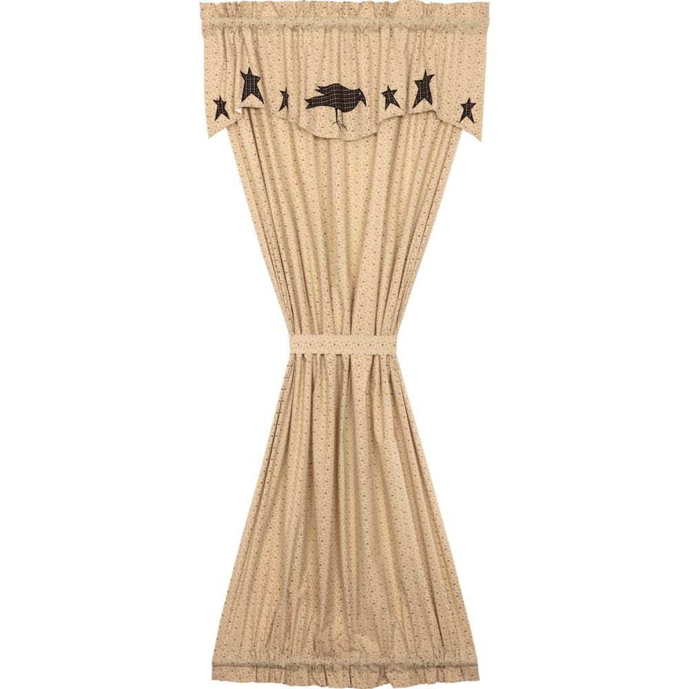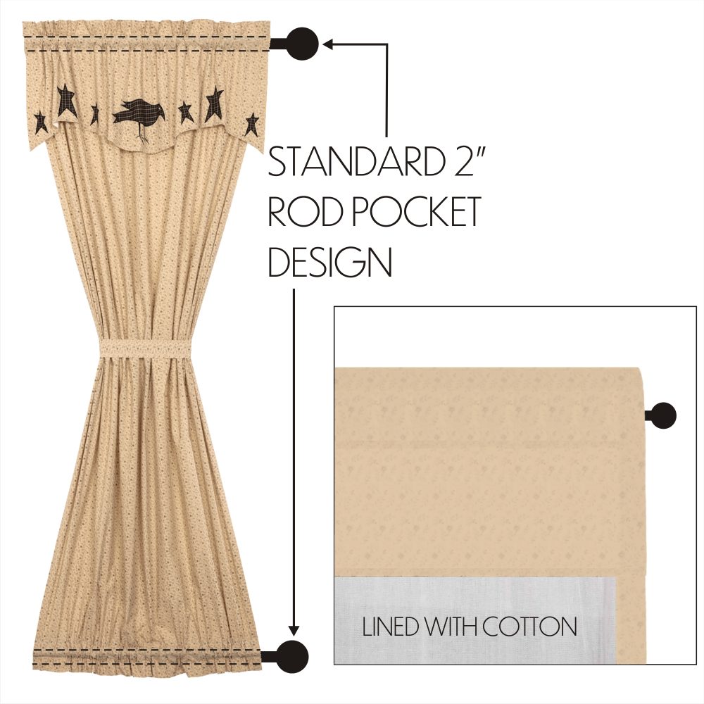 A dark creme base with a ditsy floral print gets a primitive update with an attached valance featuring 5-point star applique accents and a crow silhouette for a sophisticated accent piece with vintage style and practical benefits. The Kettle Grove Door Panel is a 72x40 inch panel crafted in 100 percent cotton with a light filtering lining for additional privacy. The attached valance features primitive applique in a rich black and tan microcheck above a scalloped edge. The row of stars is crafted in a traditional folk art style for a whimsical, slightly uneven feel that adds a pop of folksy charm to an elegant country cottage piece. This country farmhouse French door panel features a 2 inch rod pocket for easy installation (rod not included). Machine wash on gentle for easy care and line dry for best results. The panel is iron safe. To give your home a complete primitive country look, pair with other items from the Kettle Grove Collection including modern primitive swag, panel sets, kitchen accessories, bedding and more.