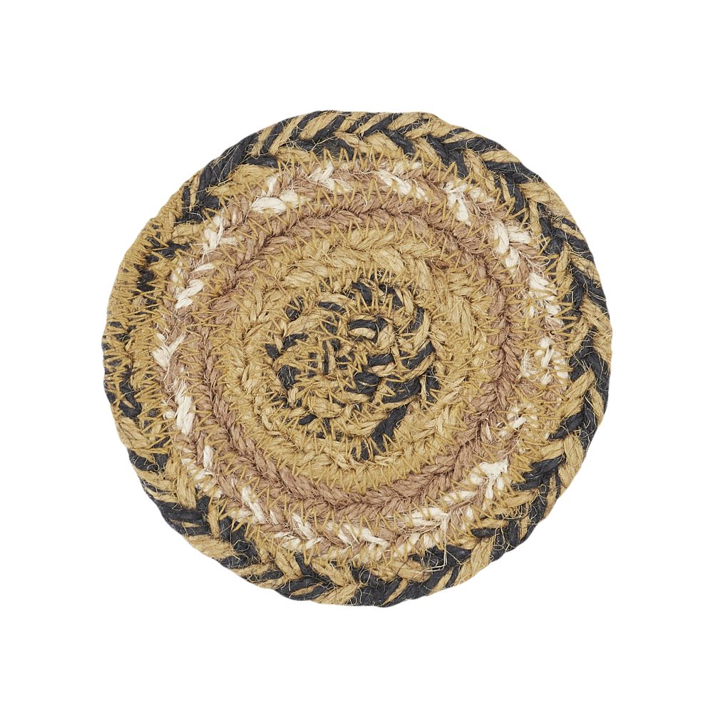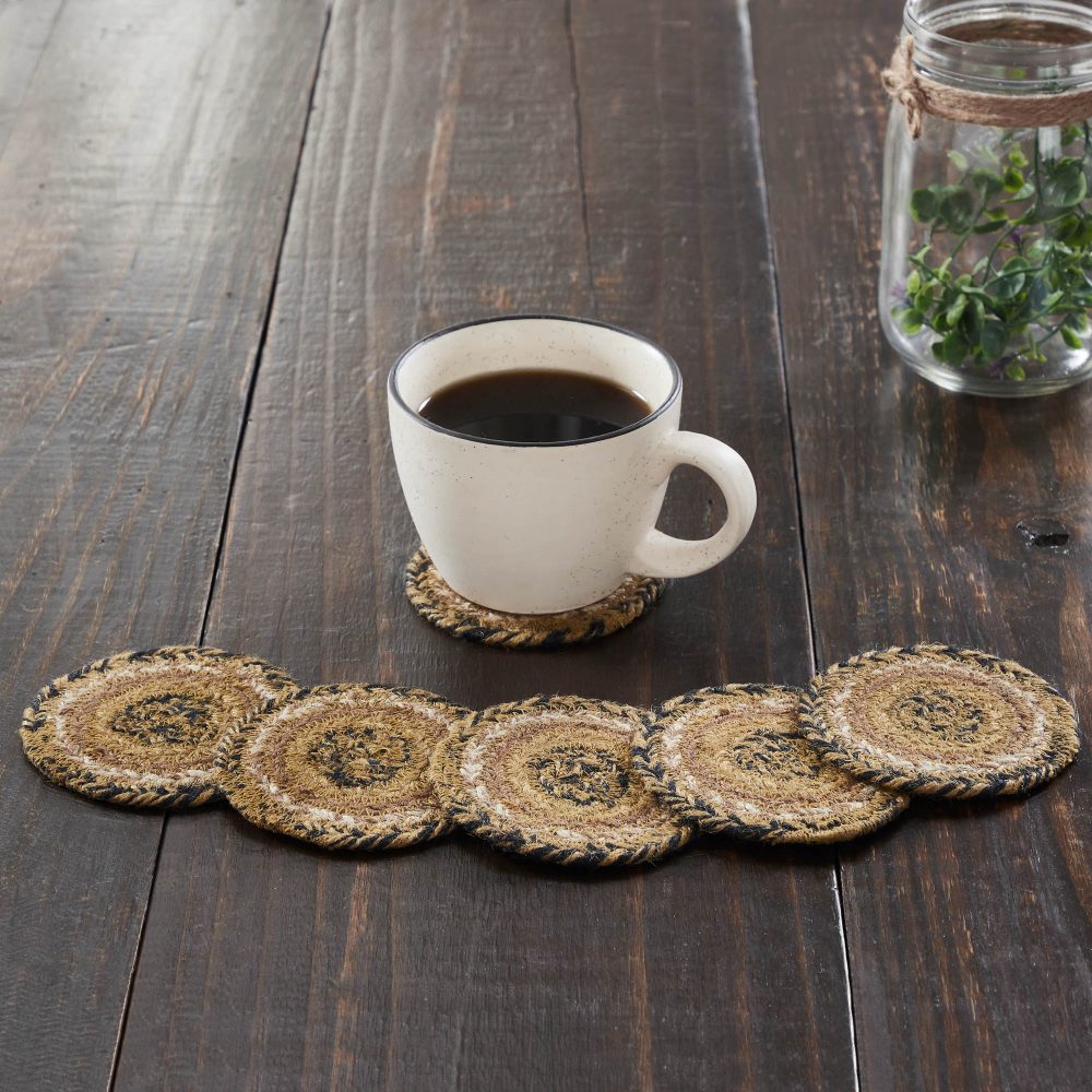 No one likes a coffee ring on their table. Protect your furniture with texture-rich, country style with braided jute in natural shades of country black, caramel and tan. The Kettle Grove Jute Coaster Set features a useful pack of six 4-inch round coasters. These classic country drink coasters provide a low-profile addition to keep beverages from harming delicate surfaces. Circular patterns in a detailed braid add a cozy, homemade feel wherever they are placed. Pair with coordinating tabletop and kitchen pieces from the Kettle Grove Collection by VHC for placemats, table runners, chair pads, and trivets in a matching modern primitive style.
