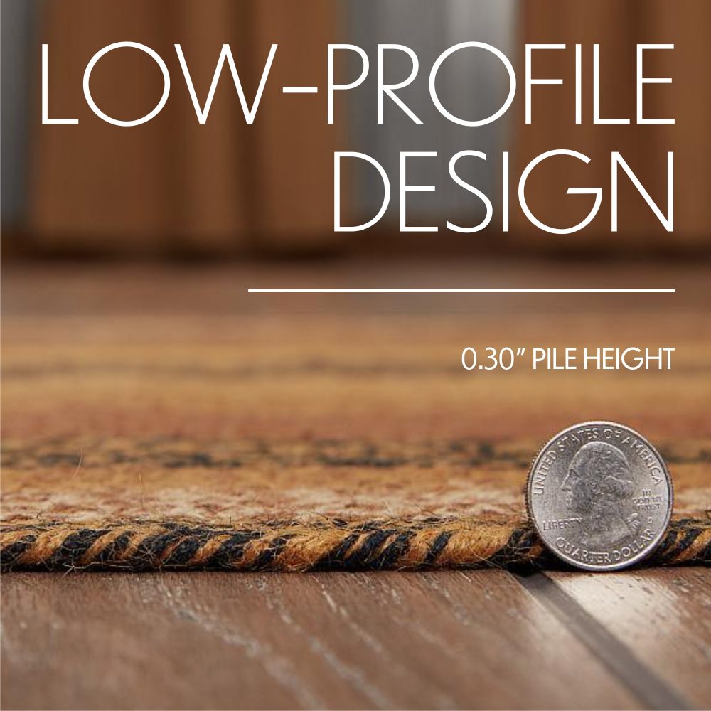 Create a warm, homey feeling with deep primitive colors in a curl-resistant jute blend that adds style and safety anywhere a mid-size accent rug is needed. The Kettle Grove Jute Rug measures 24x36 inches and features a classic oval shape and tight braids constructed with a durable jute blend. The special blend relaxes faster and stays flat. Features a blend of warm caramel, country black and dark creme for a natural, rustic look that complements a wide array of country farmhouse decor.