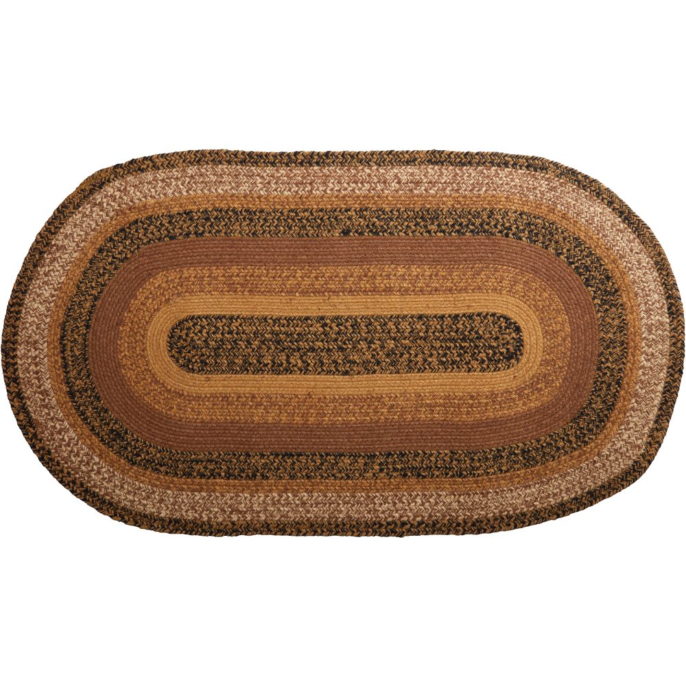 Create a warm, homey feeling with deep primitive colors in a curl-resistant jute blend that adds style and safety anywhere a mid-size accent rug is needed. The Kettle Grove Jute Rug measures 27x48 inches and features a classic oval shape and tight braids constructed with a durable jute blend. The special blend relaxes faster and stays flat. The included PVC mat makes sure your beautifully braided jute rug stays exactly where it should. Features a blend of warm caramel, country black and dark creme for a natural, rustic look that complements a wide array of country farmhouse decor.