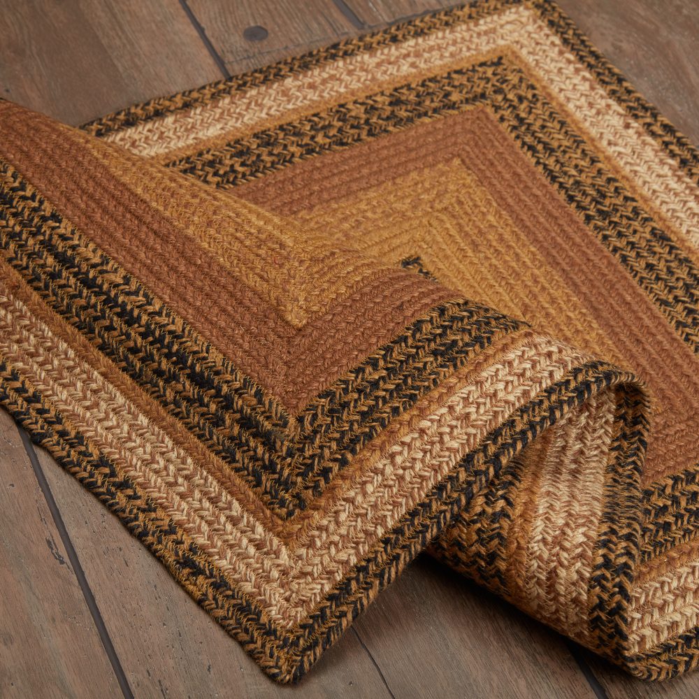 Create a warm, homey feeling with deep primitive colors in a curl-resistant jute blend that adds style and safety anywhere a mid-size accent rug is needed. The Kettle Grove Jute Rug measures 24x36 inches and features a classic rectangle shape and tight braids constructed with a durable jute blend. The special blend relaxes faster and stays flat. Features a blend of warm caramel, country black and dark creme for a natural, rustic look that complements a wide array of country farmhouse decor.