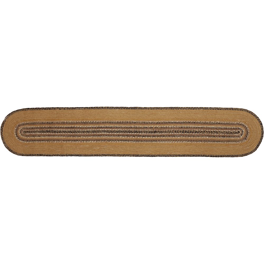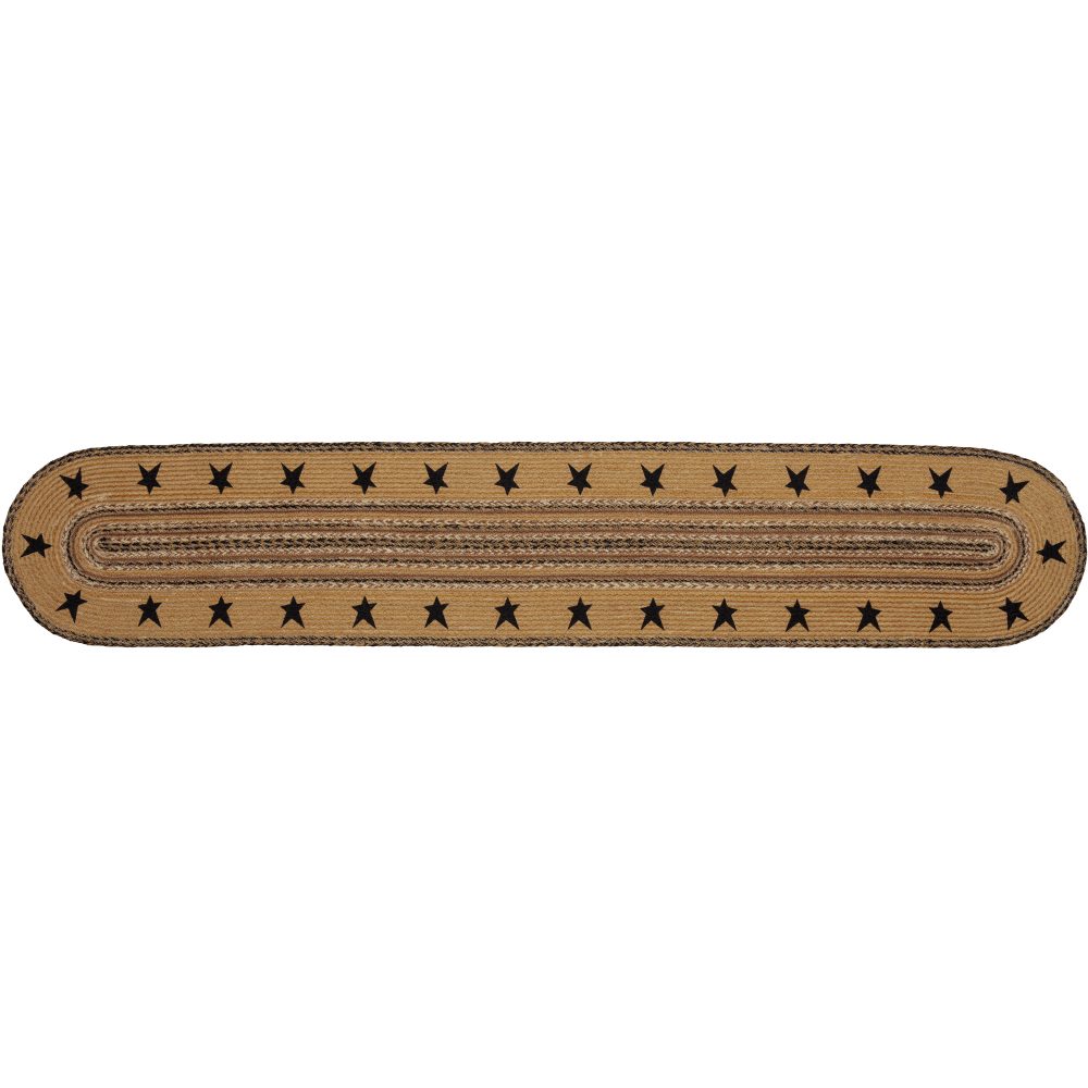 Create a warm, joyful table for friends and family to gather round with natural colors and classic texture. The Kettle Grove Star Jute Runner includes one table runner measuring 13x72 inches made from a premium Jute blend. The rich texture of braided jute is given a primitive feel with natural tan, country black and caramel tones and bold folk art stars for modern country style. Complete your tabletop decor with other pieces from the Kettle Grove Jute Collection by VHC for timeless farmhouse style.