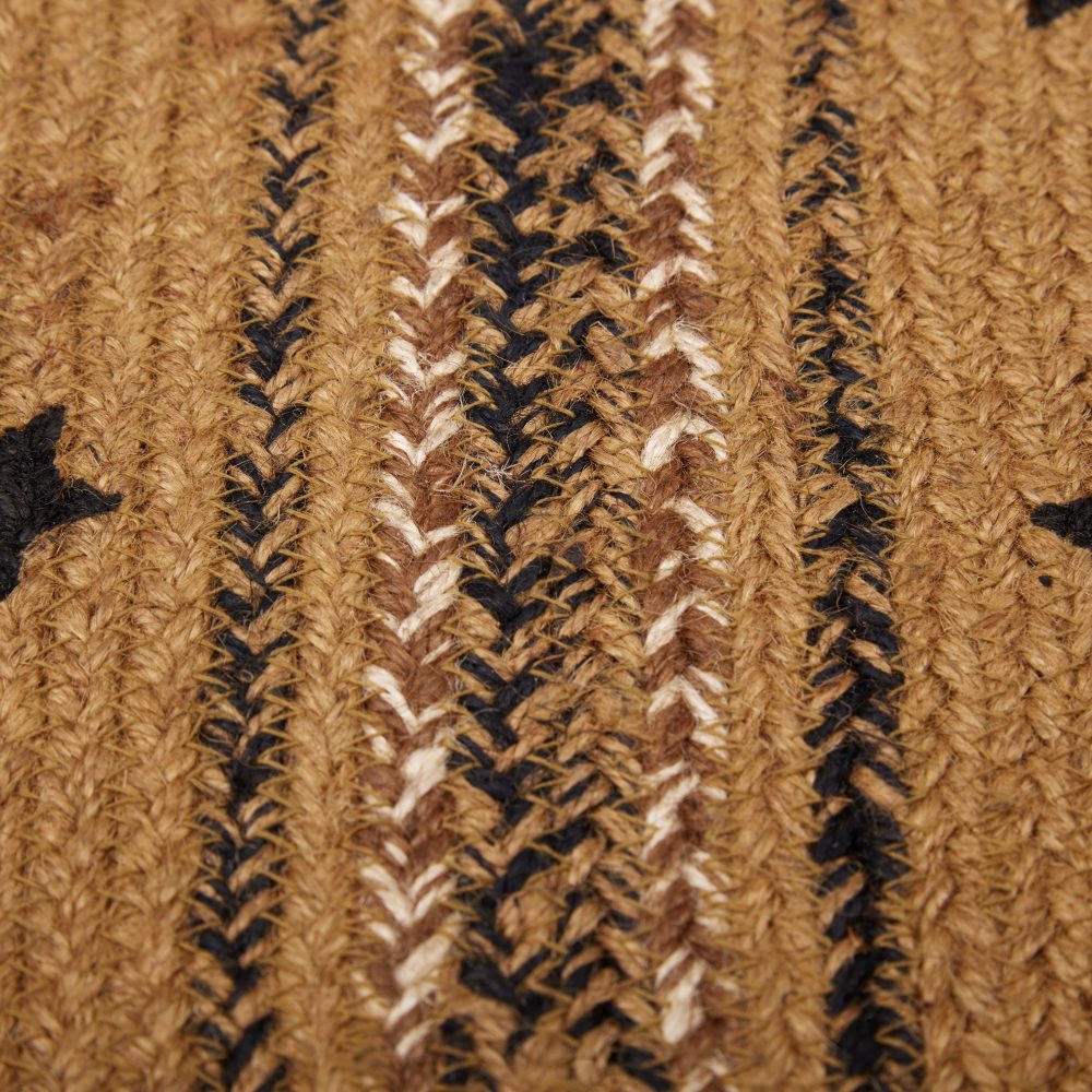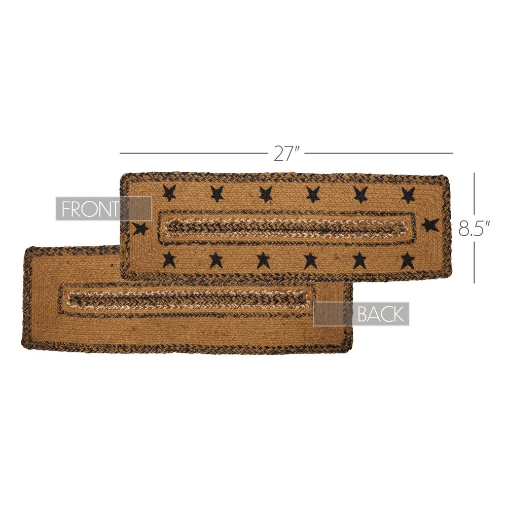 Protect stairways from damage and add style with braided jute in traditional, neutral tones. The Kettle Grove Star Jute Stair Tread Rectangle includes one 8.5x27 inch stair tread back by a latex spray to help prevent slipping. The low-profile jute features an innovative blend of 80 percent Jute and 20 percent cotton and other fibers to help the tread lay flat and resist creasing. This rectangle-shaped tread features a blend of natural tan, country black, and caramel braids surrounded by a folk art inspired loop of five-point stars for a warm, primitive country look. Coordinates with the Kettle Grove Collection by VHC for a complete modern primitive set featuring rugs, kitchen accessories and more.