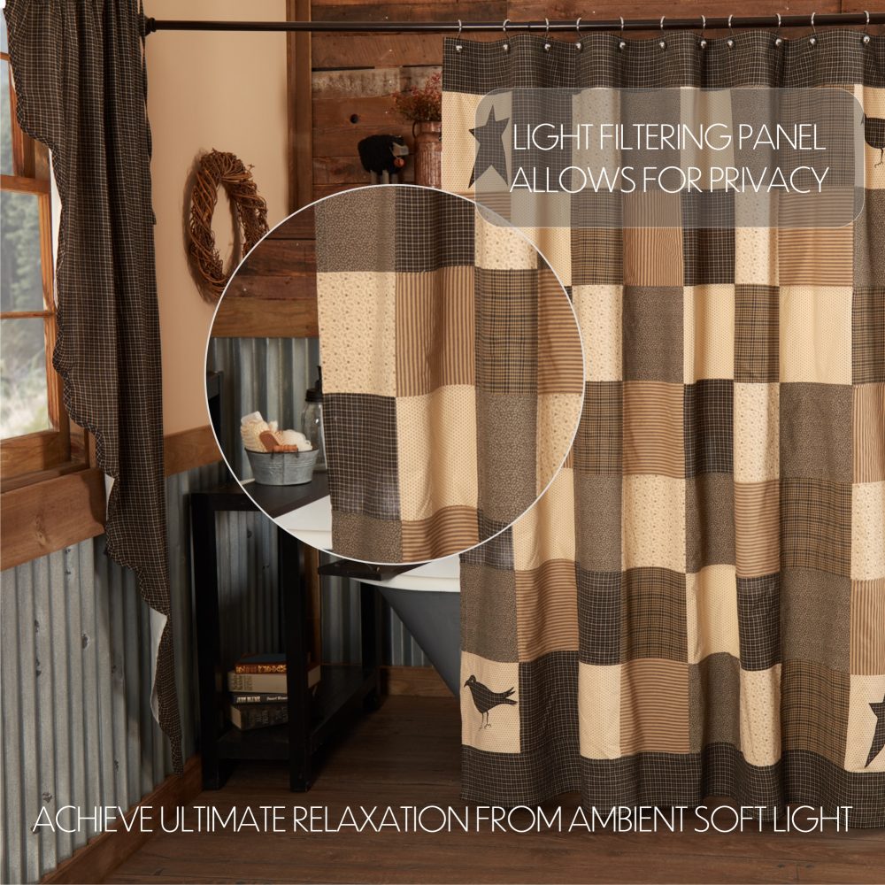 Decorate your bathroom with the perfect blend of simplicity and country charm with the Kettle Grove Shower Curtain. Featuring a black and creme patchwork with applique accents, our 72x72 fabric shower curtain provides a modern primitive touch to your bathroom decor. This machine washable, 100% cotton shower curtain includes button holes for shower hooks and a rod pocket for versatility and convenience.