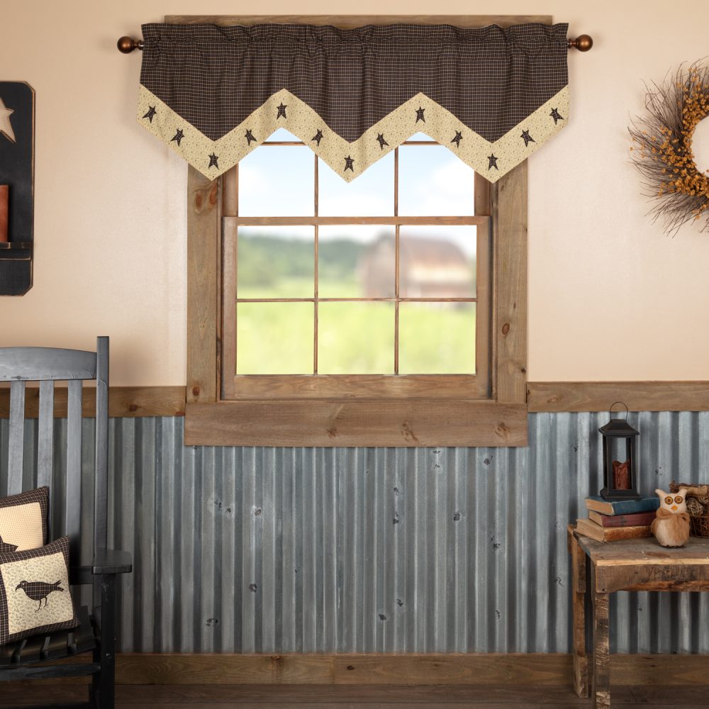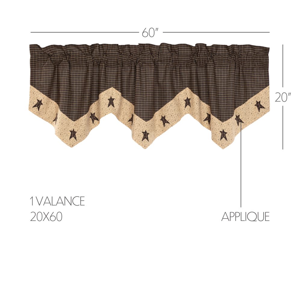 A neutral, primitive palette of khaki tan, creme and black blend the crisp lines of windowpane plaid with a soft, ditsy floral for a unique country look. The Kettle Grove Star Valance measures 20x60 inches and features a pointed edge and appliqued stars for a classic country look. A generous 3.25 inch rod pocket allows for easy hanging.