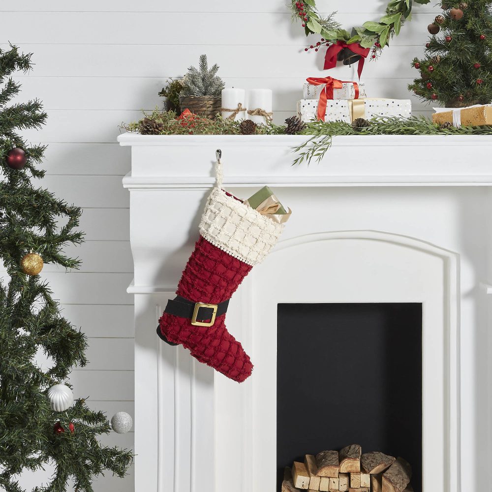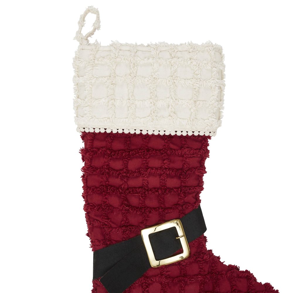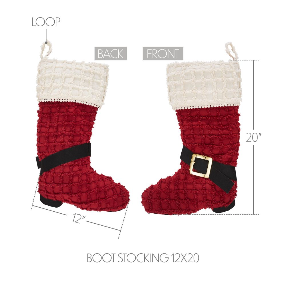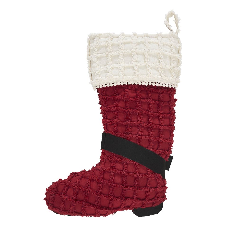 A whimsical and festive design make this Christmas stocking a delightful accent piece for your holiday home decor. The Kringle Chenille Boot Stocking measures 12x20 inches and features a charming boot design reminiscent of Santa's famous footwear. The base of the stocking features a quilted red fabric with a black and gold heel and buckle design. The cuff contrasts with an off white tone with a flat mini pom pom border. For a complete traditional Christmas look, pair with other items from VHC's Kringle Chenille Collection.
