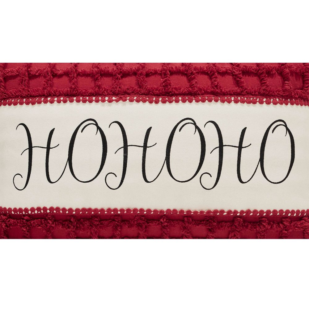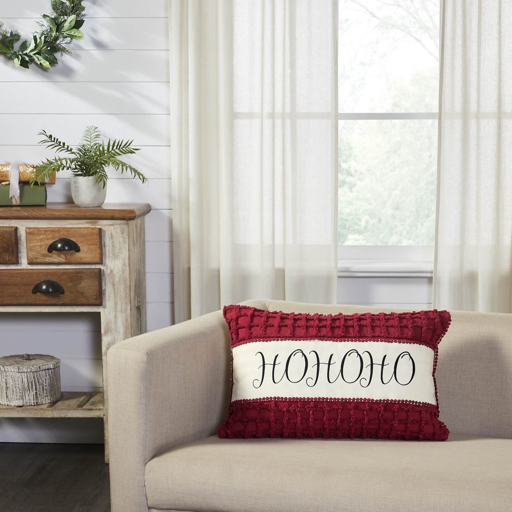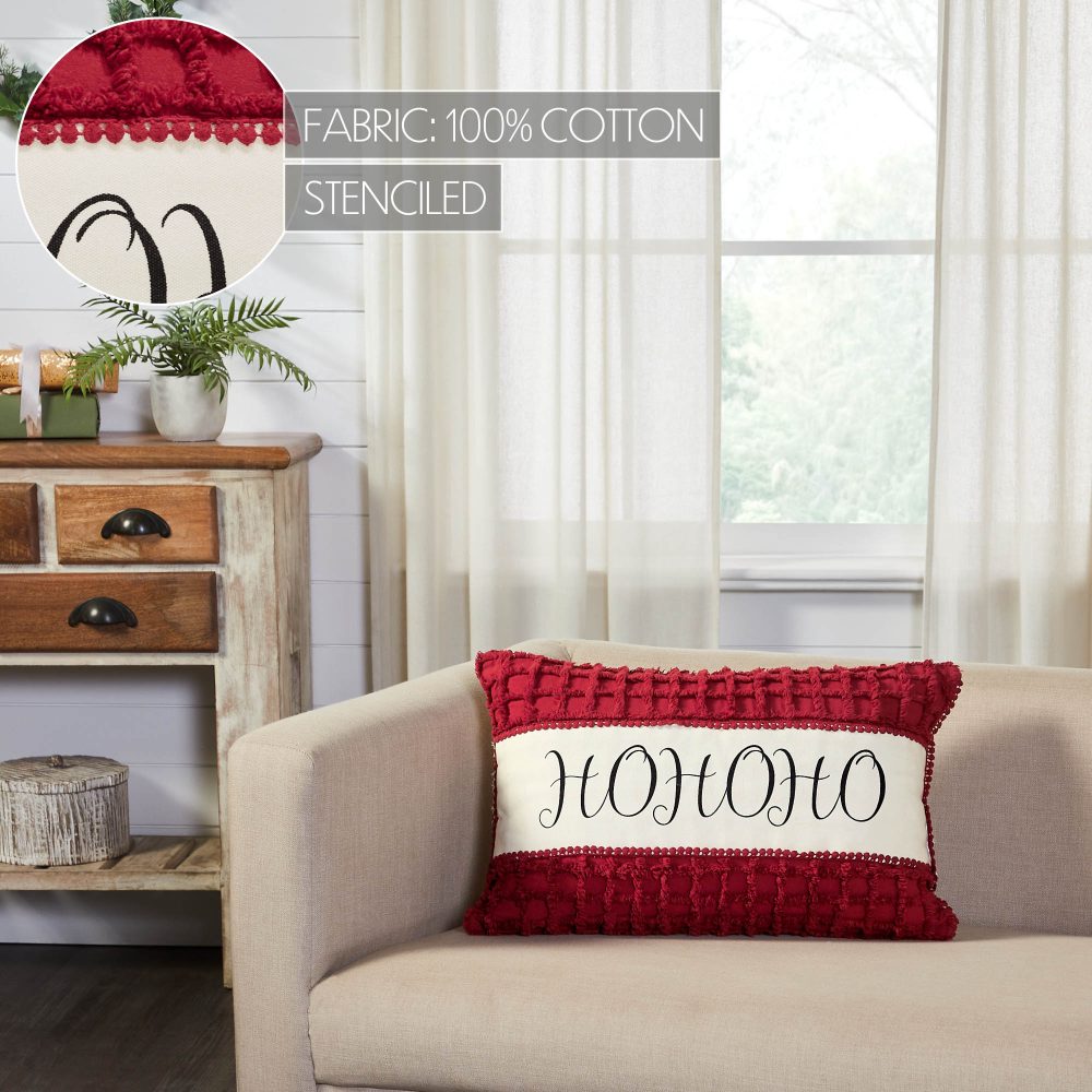 Add festive style with this Christmas accent pillow. The Kringle Chenille Pillow measures 14 by 22 inches. The filled pillow features a charming distressed print for a vintage feel. A bold classic red front features a creme overlay with printed word art reading, HOHOHO in a graceful script. The cozy home accessory reverses to soft creme for casual style while a mini pom pom border produces a warm and cheerful look. Spot clean as needed. Coordinates with the Kringle Chenille Collection by VHC for classic Christmas style for your whole home.