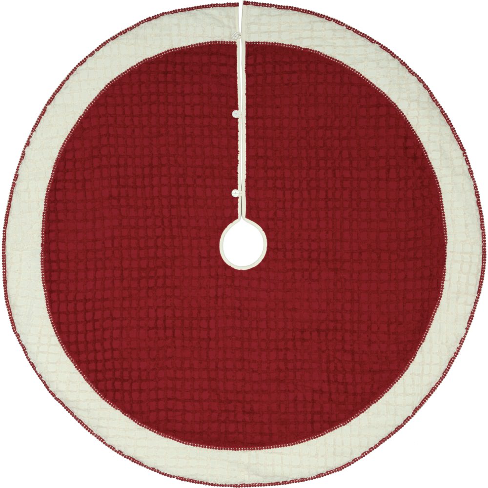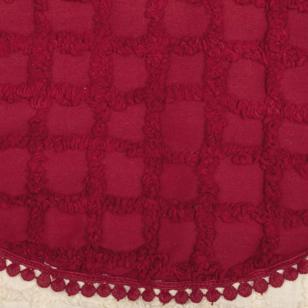 Celebrate Christmas this year with the charming Kringle Chenille Tree Skirt under your tree. Featuring a stunning chenille canvas in red and white beautifully designed in a flocking technique for added texture and unique presentation. The inner circle and outer edge of this holiday tree skirt is finished with a pom pom lace to create a trendy, classic Christmas look perfect to match your traditional tree decorations. Reverses to solid white.