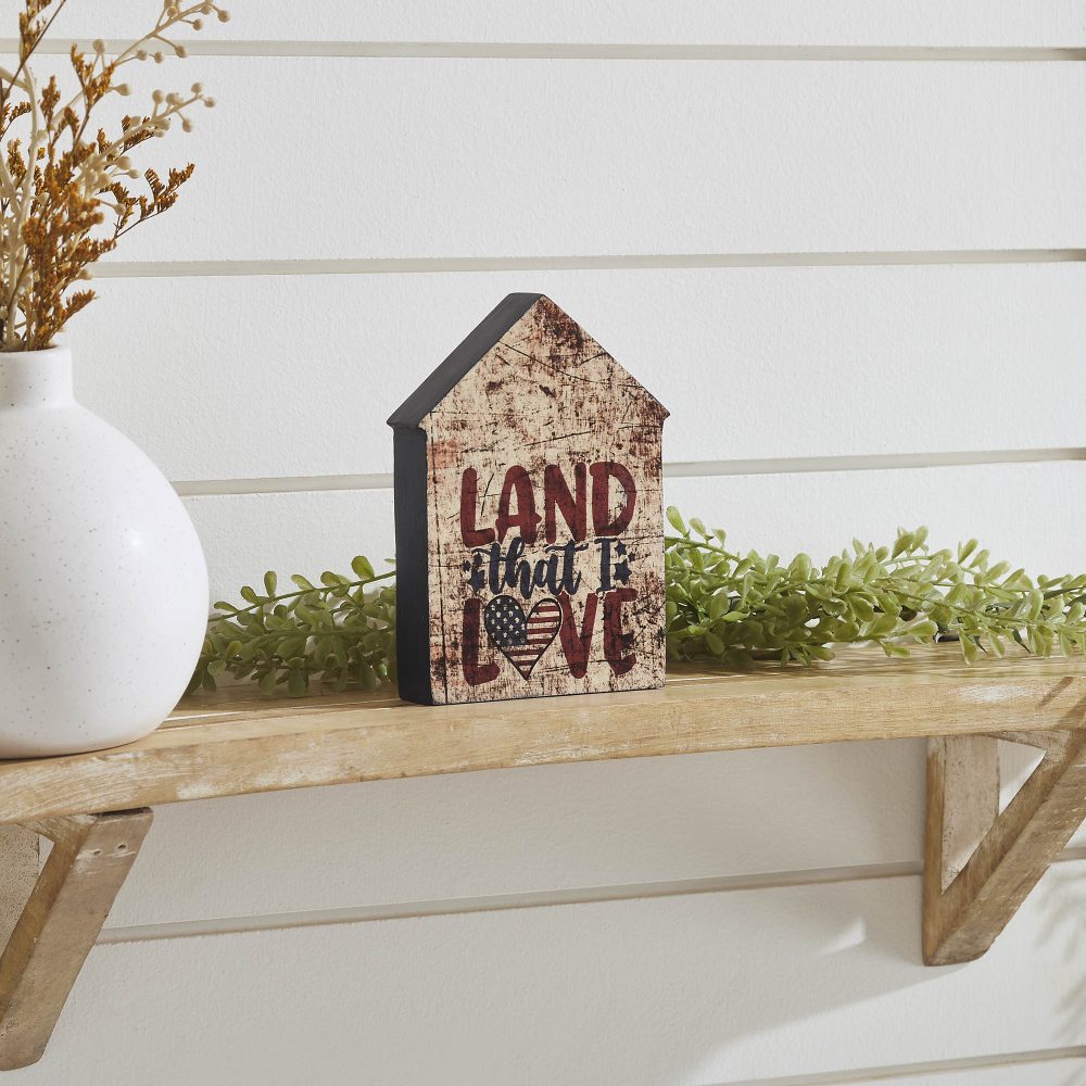 Celebrate your love for home and country with the VHC Brands Patriotic Land That I Love House Shaped Block Sign 6x4x1. This charming decorative sign features the heartfelt quote "Land That I Love" in rich burgundy and navy tones on a dark tan base. The design is highlighted by a flag-painted heart that replaces the "O" in "Love," adding a touch of patriotism to this uniquely crafted house-shaped piece. The deeply distressed finish gives it a vintage, rustic appeal, making it a perfect addition to your Independence Day or year-round farmhouse decor. Compact and versatile, this house-shaped block sign is ideal for display in living rooms, dining rooms, kitchens, bedrooms, bathrooms, or entryways. Its warm color palette and Americana-inspired design blend seamlessly with rustic and country-style interiors, creating a cozy and inviting atmosphere. Place it on shelves, mantels, countertops, or tabletops to add a touch of patriotic charm to your decor. Maintaining the VHC Brands Patriotic Land That I Love House Shaped Block Sign is easy-simply wipe it clean with a soft cloth to preserve its vibrant digital print and distressed finish. Whether used as a standalone piece or paired with other patriotic accents, this sign delivers quality craftsmanship, timeless style, and meaningful sentiment. It's the perfect way to honor the spirit of Independence Day while celebrating the values of love and freedom in your home.