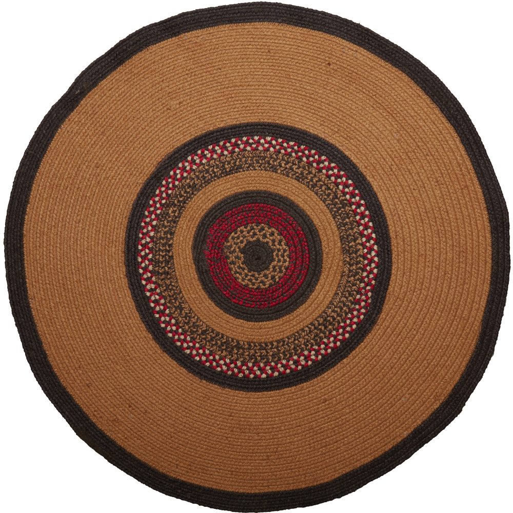 The Landon Jute Stars Rug warms a room with primitive color and cozy design. Showcasing variations of chestnut, almond brown, and chili pepper red on braided durable jute, our 3-foot diameter rug combines old fashioned country style with early American themes. With stenciled red barn stars decorating the edge, this round jute rug adds Western appeal to your entryway, kitchen, or bedroom. For a slightly different look, the reverse side features the same design as on front but without the 5-point stars.