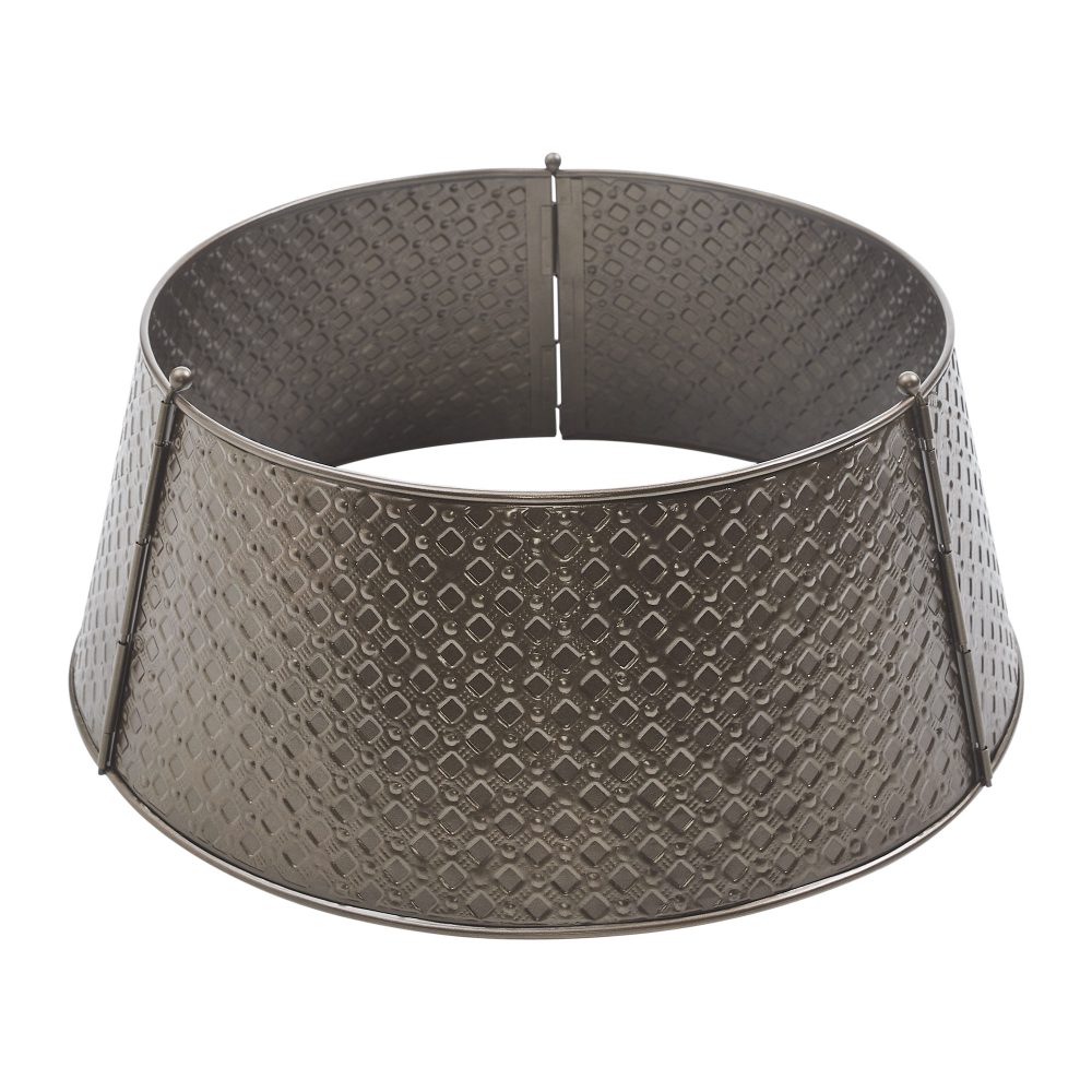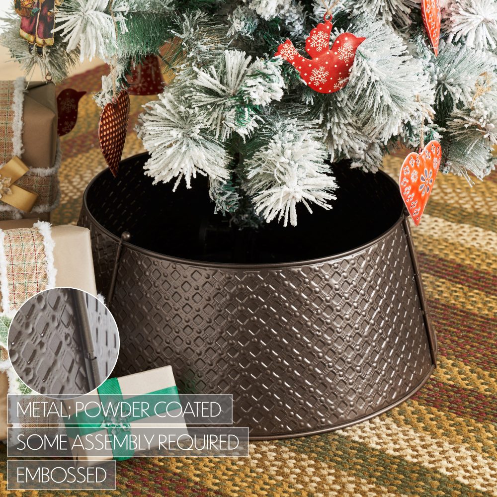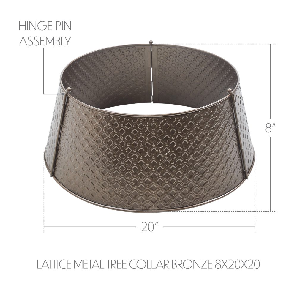 Enhance your holiday tree with the VHC Brands Lattice Metal Christmas Tree Collar in a rich bronze finish. Measuring 8x20 inches, this beautifully crafted tree collar features an elegant lattice pattern combined with delicate snowflake designs, adding festive charm and texture to your Christmas decor. Its warm bronze tone brings a cozy, vintage-inspired glow that perfectly complements primitive rustic and traditional holiday themes. Made from durable metal, this tree collar is equipped with a convenient hinge pin assembly for easy installation and a secure fit around your tree base. The solid bronze color and classic round shape provide a refined foundation that elevates the overall look of your holiday centerpiece. This accessory offers a stylish alternative to traditional tree skirts, merging functionality with timeless festive appeal. Ideal for use throughout your home-in the bathroom, bedroom, dining room, entryway, kitchen, or living room-this Lattice Metal Christmas Tree Collar brings warmth and holiday spirit to any space. Maintenance is simple with a quick wipe using a soft cloth to maintain its radiant bronze finish year after year. This elegant piece is a perfect addition to create a cohesive and inviting Christmas atmosphere.