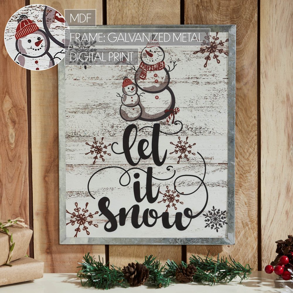 Add a heartwarming touch to your holiday decor with the VHC Brands Let It Snow Snowman Framed Wall Hanging Sign. Measuring 15x12 inches, this charming rectangular sign features the phrase "Let it Snow" adorned with a delightful depiction of a snowman family and falling snowflakes. Against a backdrop of light creme, country black, and burgundy, this classic Christmas-themed design evokes the cozy charm of a winter wonderland. Crafted from durable MDF, this wall hanging sign is designed to withstand the holiday season with ease. The distressed appearance adds rustic appeal, while the digital print ensures the snowman family and snowflakes are depicted in crisp and vibrant detail. With pre-drilled holes for easy hanging, you can effortlessly display this sign in any room of your home, from the bedroom to the living room, spreading holiday cheer throughout your living space. Create lasting memories and evoke the magic of the season with the VHC Brands Let It Snow Snowman Framed Wall Hanging Sign. Whether hung on a wall or door, this enchanting decoration adds a festive touch to your Christmas decor. Celebrate the joy of the holidays with family and friends as you gather around and admire the heartwarming scene depicted on this charming wall hanging sign.