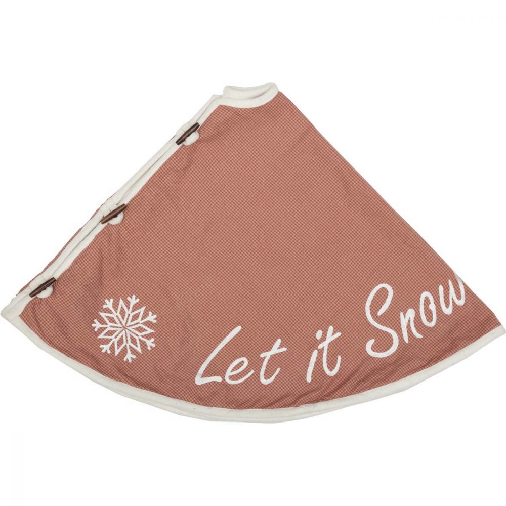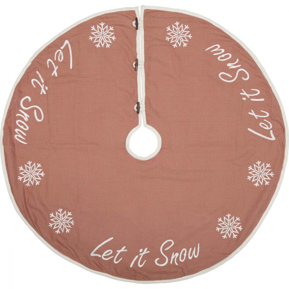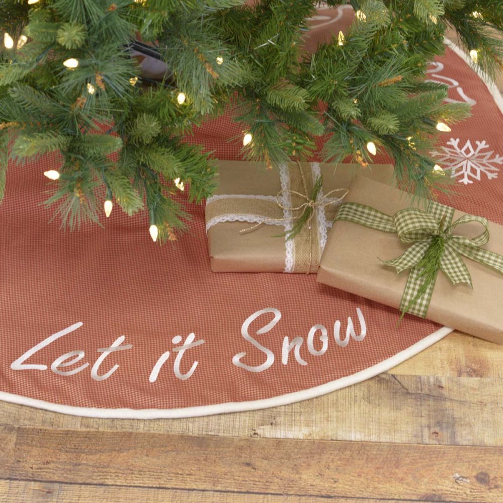 - DETAILED FEATURES: This truly festive tree skirt features apple red and almond micro-houndstooth cotton fabric. "Let It Snow" with snowflakes embroidered in white are repeated around the outside edge for added holiday charm and unique texture. The opening trimmed with .5" creme felt binding, turned edge seam around outside, and reverses to solid creme felt.