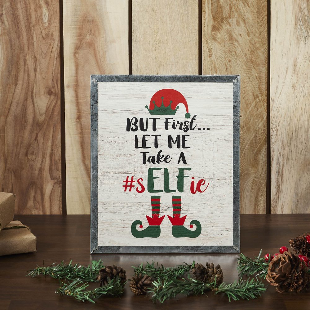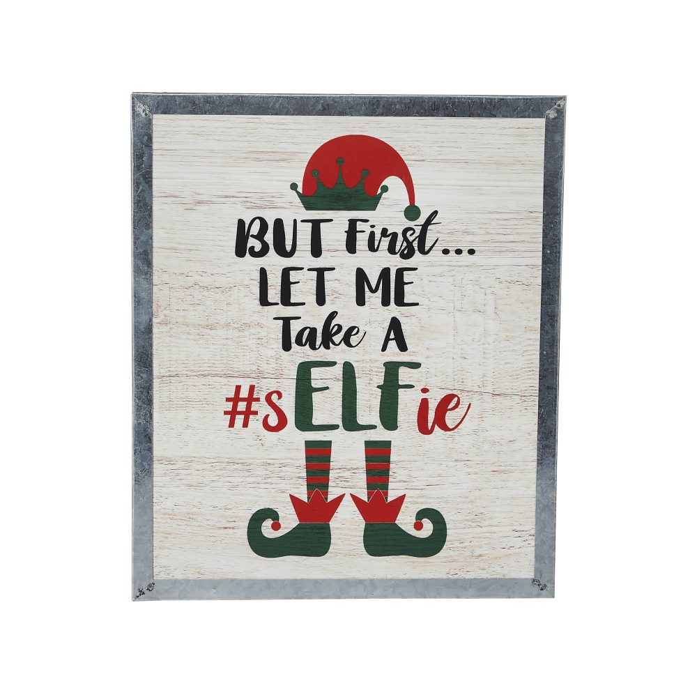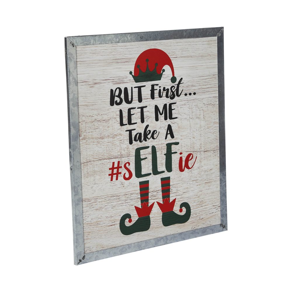 - Elevate your holiday decor with this charming wall hanging sign, measuring 12×10 inches, adorned with the playful message “But First Let Me Take a sELFie” featuring classic Elf Hat and Shoes.