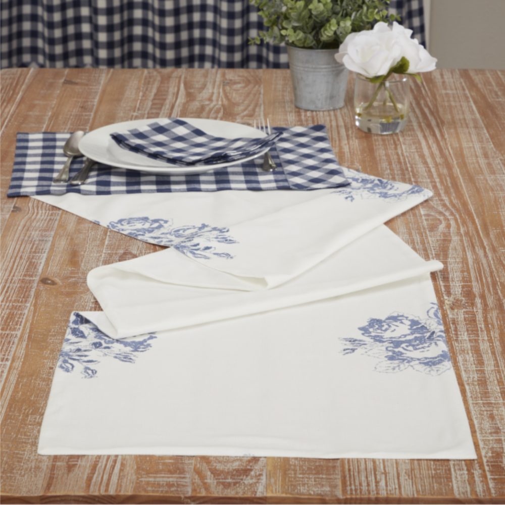 The Lydia Blue Collection brings relaxed sophistication to your farmhouse with a fresh, modern palette and lush, floral pattern. Soft white fabric is the perfect background for lovely blue tones that keep the look understated and refined. Floral designs are back in home decor in a big way, but these are NOT your grandmother's patterns! Large, detailed motifs offer a feminine touch to tabletops without looking fussy or overwhelming your interiors. The flower motif repeats in a regular pattern offering a restful balance in design which gives the Lydia Runner its stylish, fluid aesthetic. Our Lydia Blue and Vintage Check Blue Collections were designed to be layered together flawlessly, so that you can mix and match them to your heart's content, creating a look that's just right for you. Be sure to browse through the Betsy Collection, as these linens feature fabric from Vintage Check Blue and Lydia Blue as well.